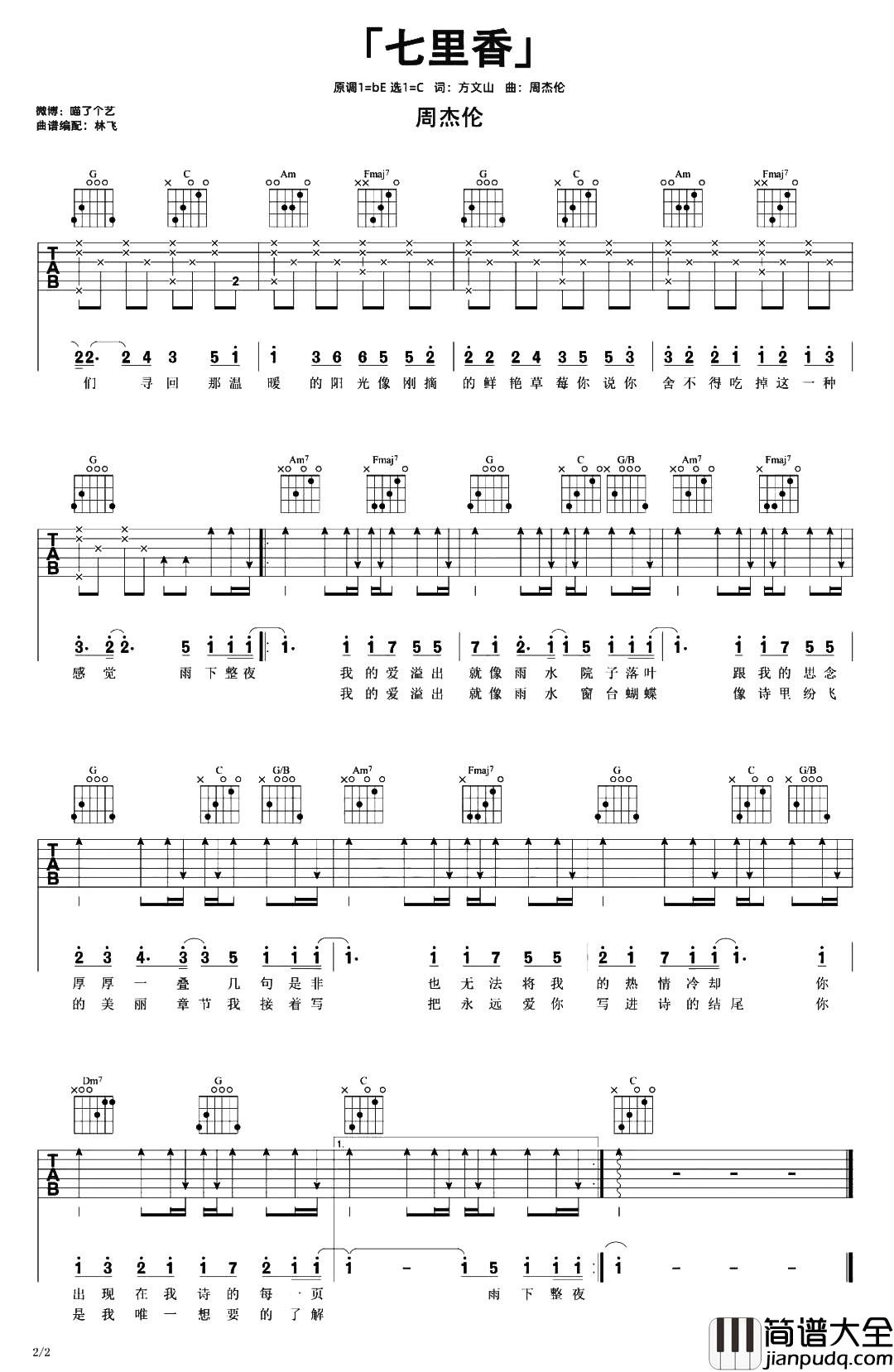 七里香吉他谱,共2张高清图片谱,由喵了个艺制谱分享,选用C调指法,原调bE,包含完整前奏,弹唱难度较为简单,喜欢这首《七里香》的朋友不妨参考下方的吉他弹唱+教学视频,帮助练习。
