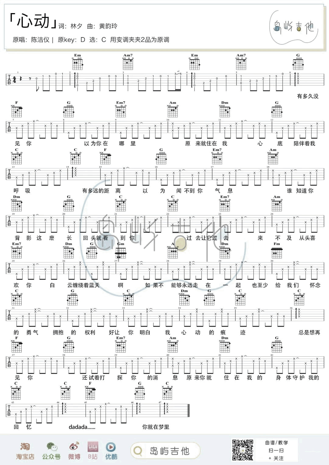 一首跨越世纪的爱情金曲,金城武和梁咏琪主演的爱情电影《心动》主题曲,心动吉他谱,选调C,变调夹夹第二品为原调D调,感谢尼克猫老师《心动》吉他弹唱演示和教学视频。