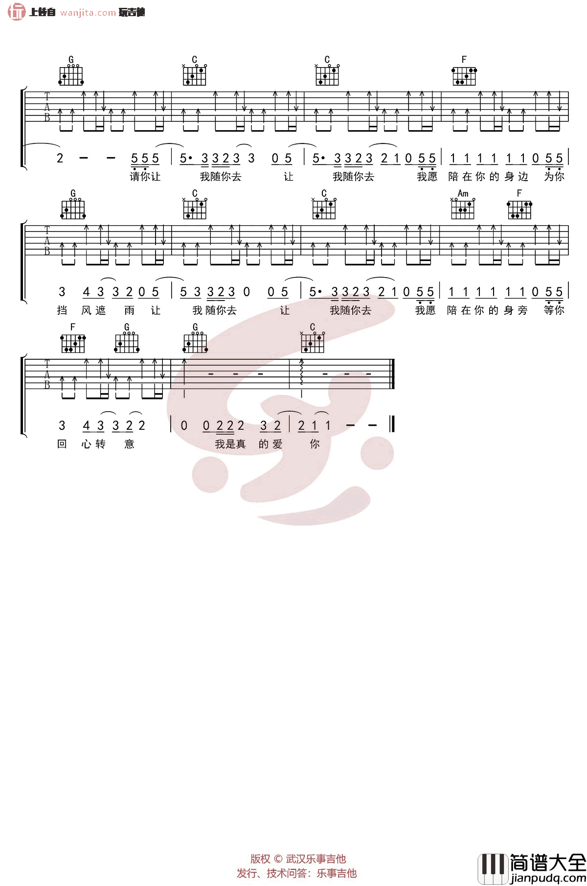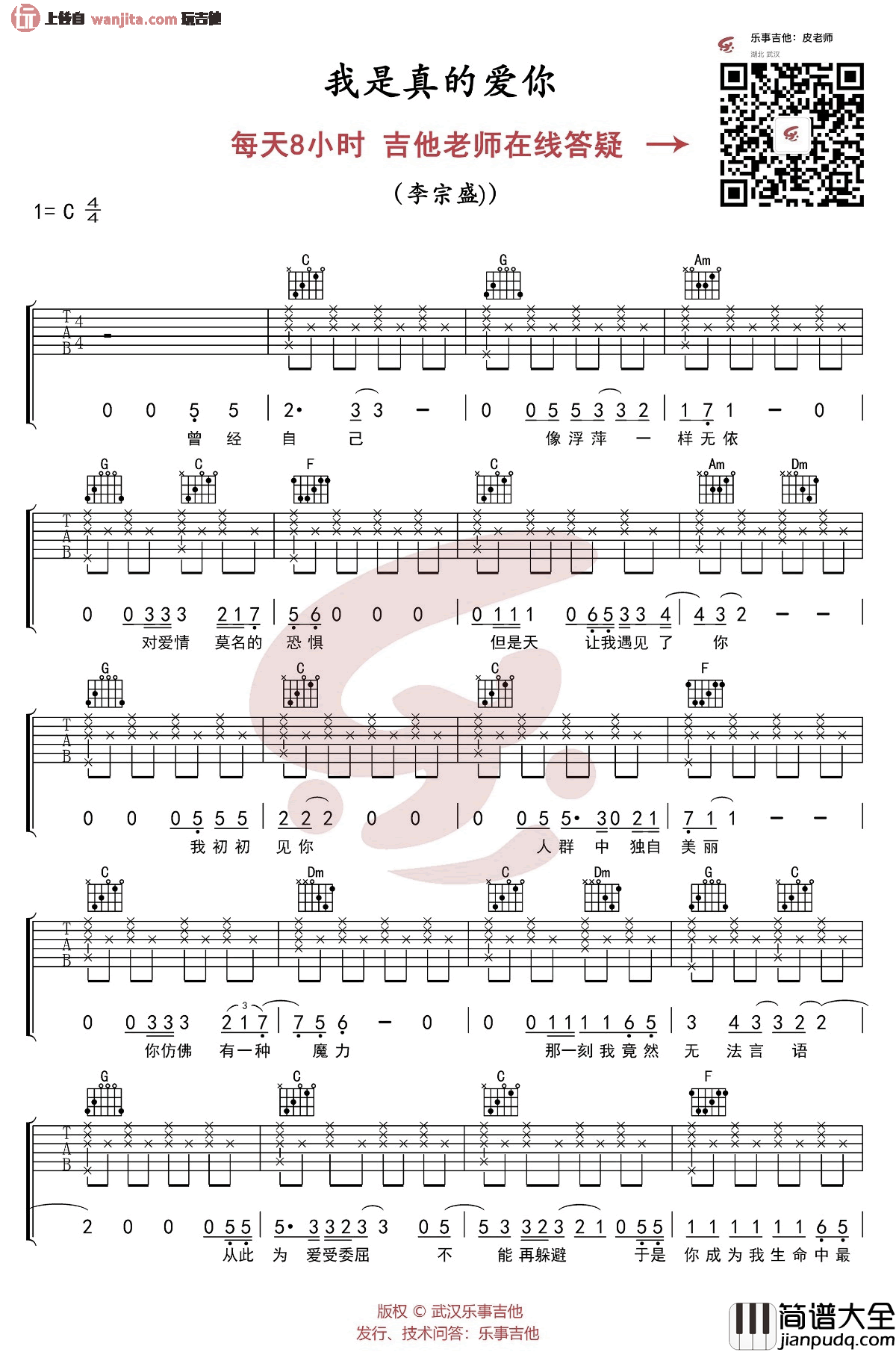 《我是真的爱你》吉他谱,选用C调指法编配,这首谱子主要以半分解和弦弹奏,难度不大,适合新手练习弹唱。