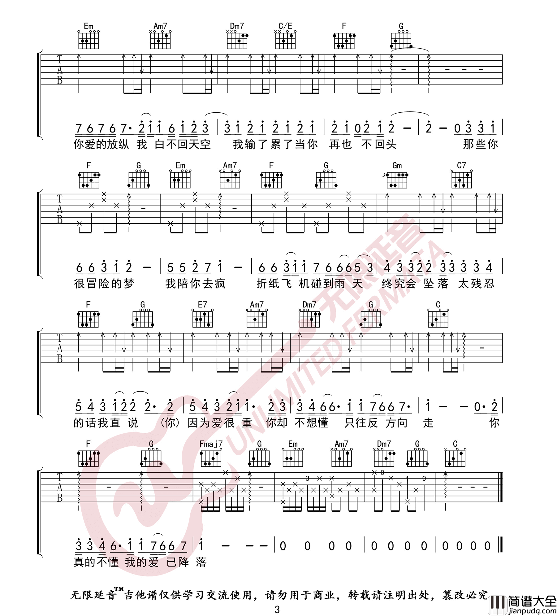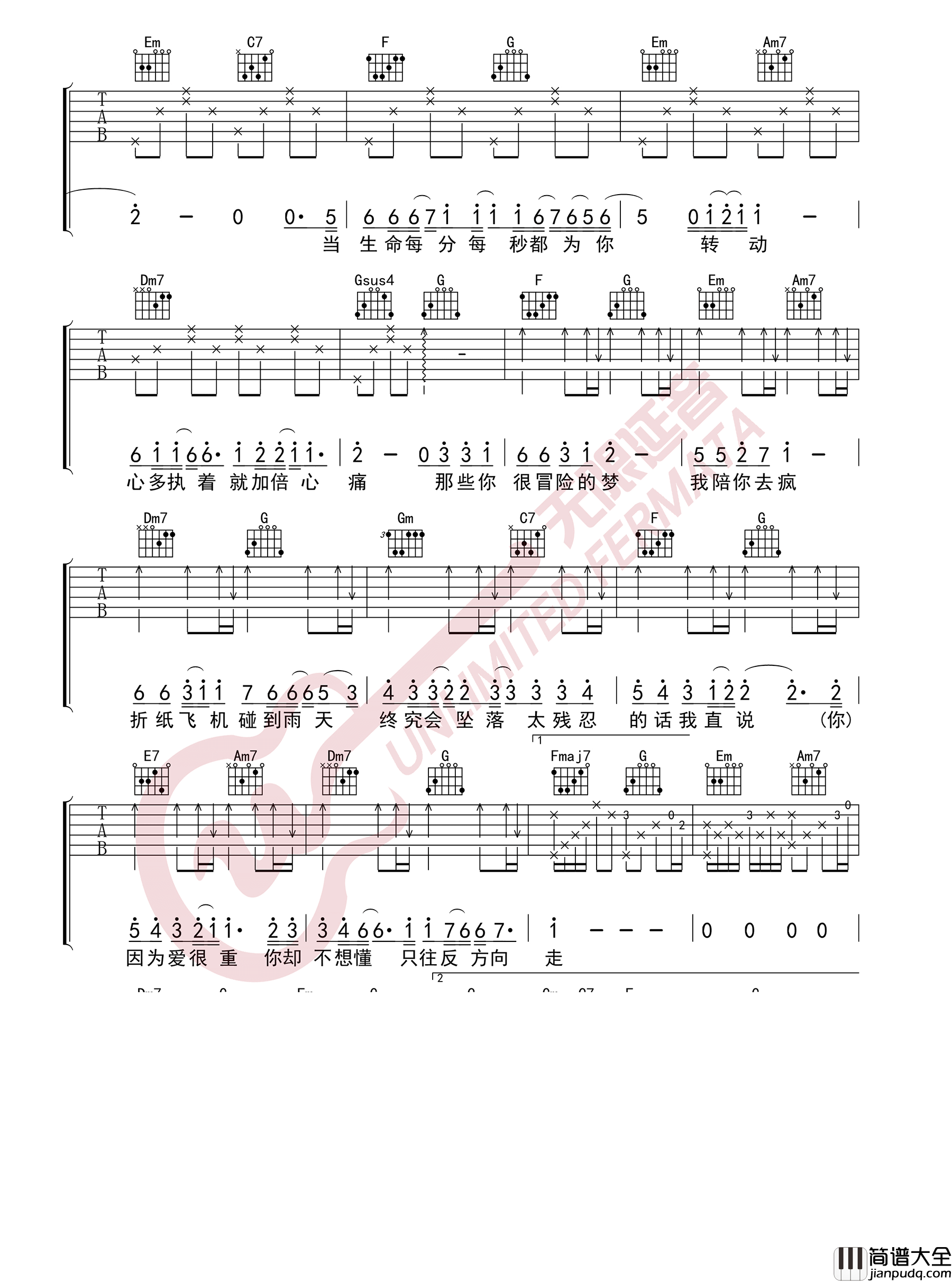 此版本的曲谱来源于无限延音扒谱制谱,歌曲原调为D调,这里采用了C调指法根据原版进行编配,演唱时夹变调夹2品即可回到原调。这首歌编配难度不大,前奏和尾奏部分穿插着一些旋律音,其他部分使用的和弦及节奏型都是十分简单,比较容易练习。