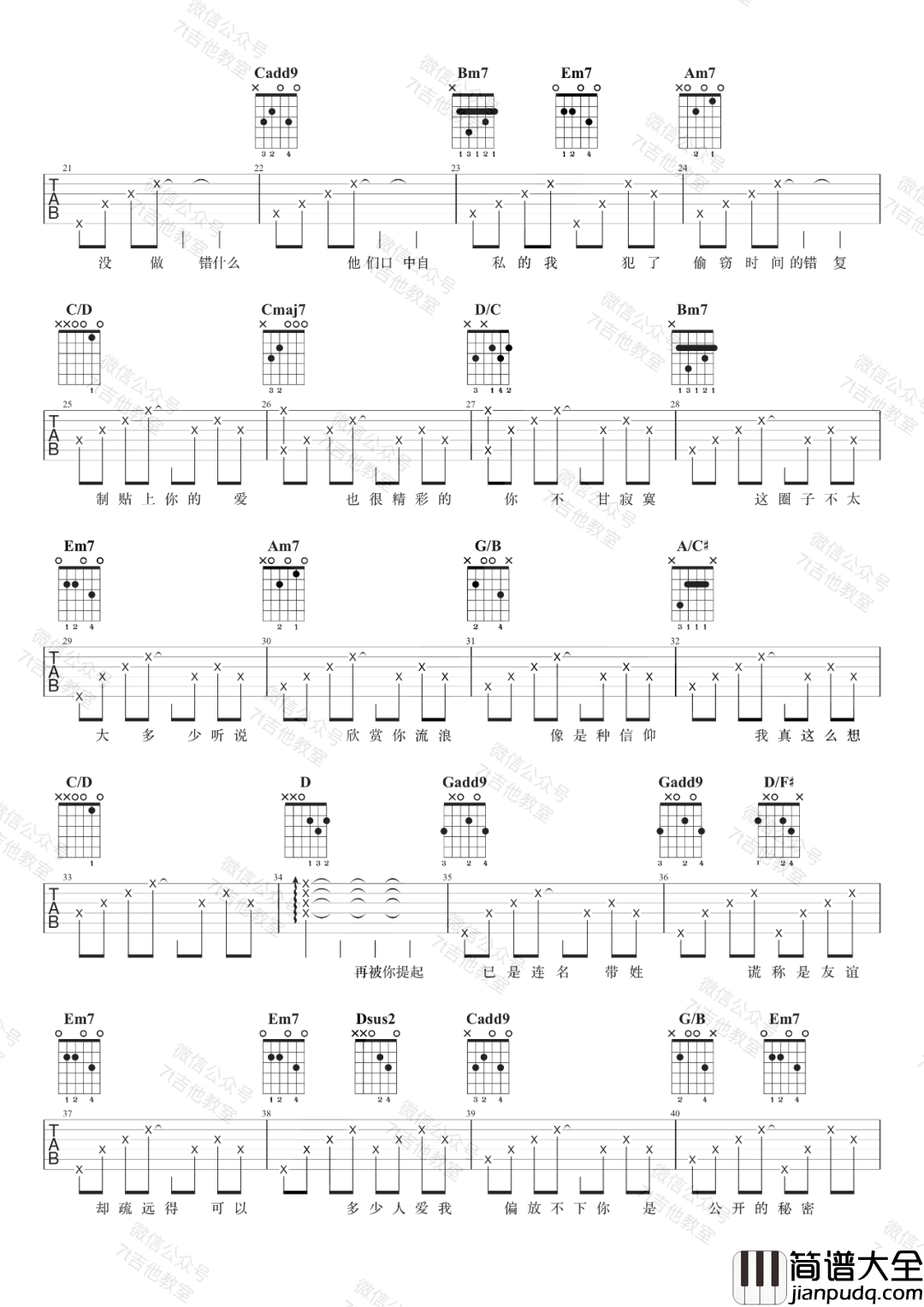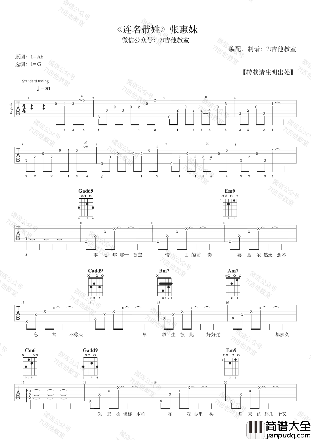 《连名带姓》吉他谱的原调是Ab大调,谱子以及视频演示用的是G大调的指法来编配,视频里是标准音调弦,变调夹夹在第3品,适合音域较低的男生。这首歌唱出了很多人爱情的心声,拨动大家心中难忘的思念。配合阿妹浓烈的感情演出,成就了一首经典的曲目。