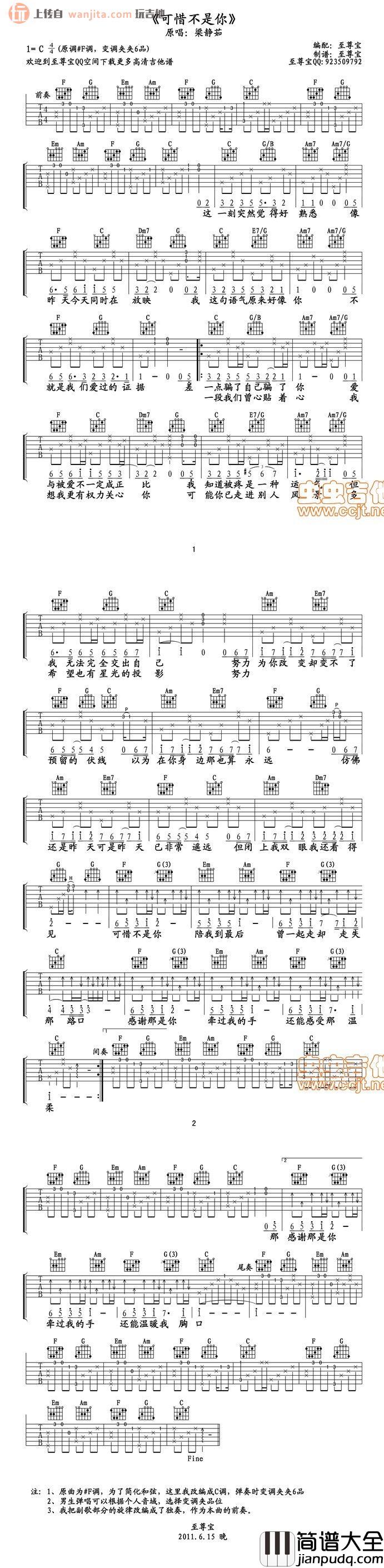 可惜不是你吉他谱,总共1张高清图片谱,原调为#F,选用C调指法,弹唱时变调夹可以夹在6品弹唱原调,男生可以根据自己的音域进行调整,副歌部分旋律改为了独奏,也顺便作为本曲的前奏,大家可以参考结合练习。