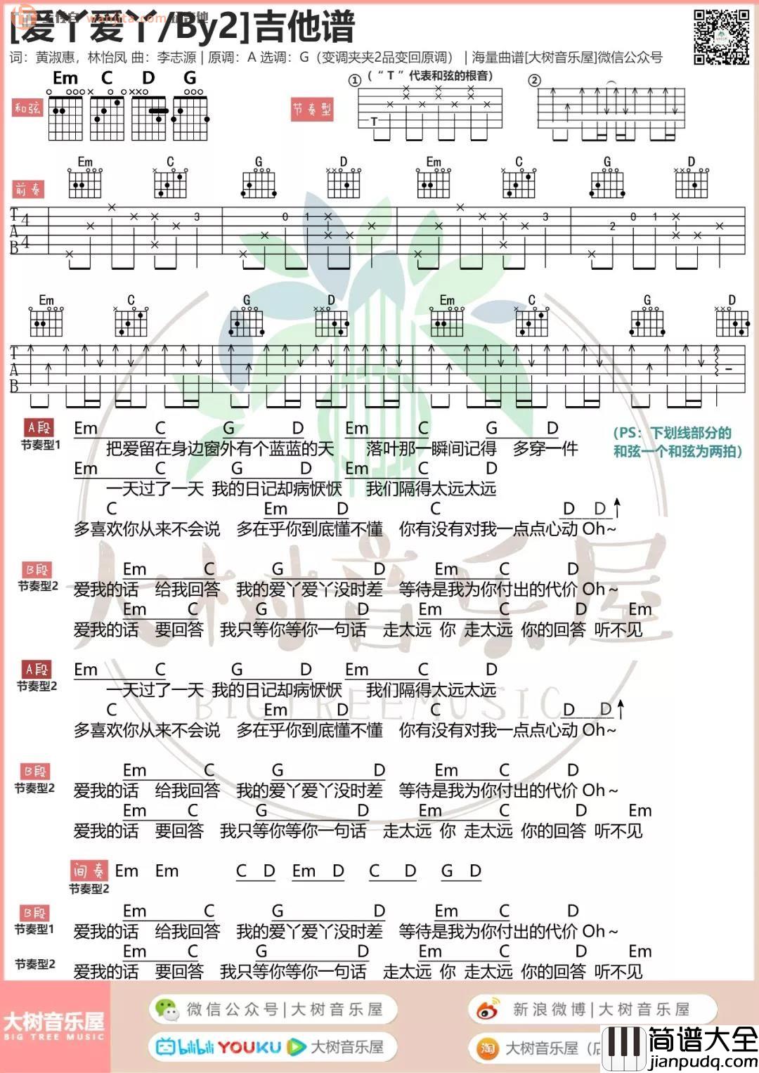 《爱丫爱丫》吉他谱,原调是A调,选用G调指法编配,由大树吉他音乐屋分享,下方谱子是一个和弦谱,大家不要觉得和弦谱就简单了,其实很多歌曲也并没那么复杂。当然呢,这个谱子总共只用到了4个和弦,不过确实也是太简单啦,节奏呢可能需要注意一下扫弦的节拍控制,其他的部分大家可以先行练习。当然由于歌曲节奏的特殊性,大家可以更加随性一点的加花玩出自己的感觉。