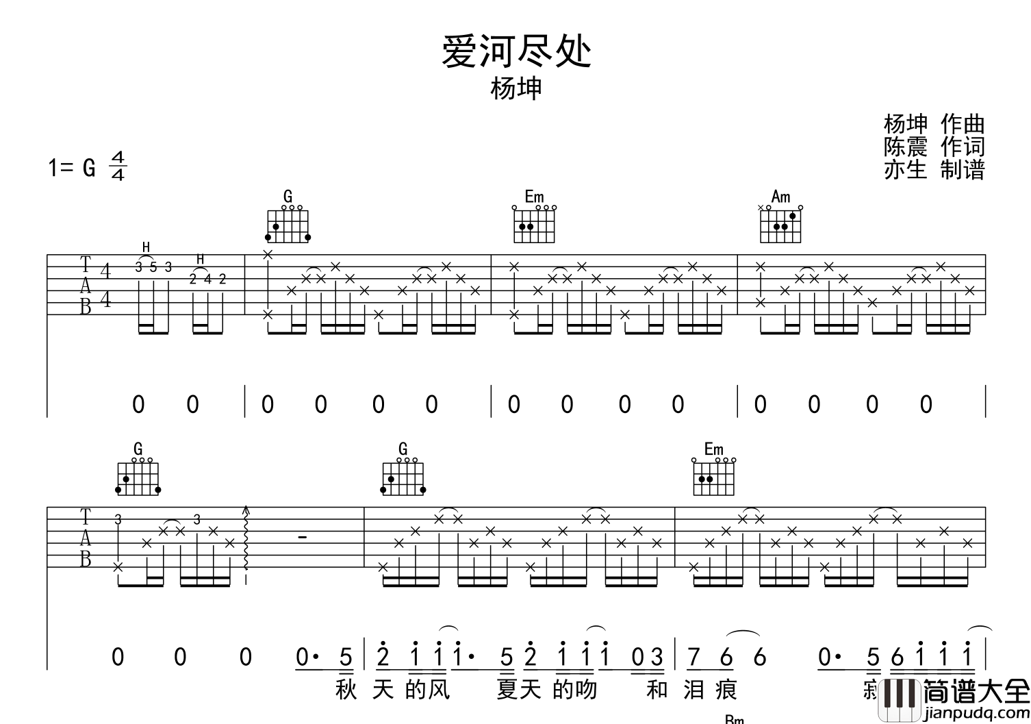公众号:绵羊乐谱 杨坤《爱河尽处》吉他谱,由@亦生制谱,《爱河尽处》吉他六线谱,共四张图片谱,本吉他谱采用G调指法编配,节奏为4/4拍,变调夹不夹演奏,演奏的速度控制在每分钟95拍左右,指法难度简单。 公众号:绵羊乐谱 | 官方QQ群:978773290 不吃独食,学会分享!本文链接:http://www.shaomingyang.com/btb/31102.html 转载请标明出处,尊重原创(๑╹◡╹)ノ。如信息有误或版权疑问,请通过网站底部联系我们会第一时间处理,感谢理解支持(◕ᴗ◕✿)!