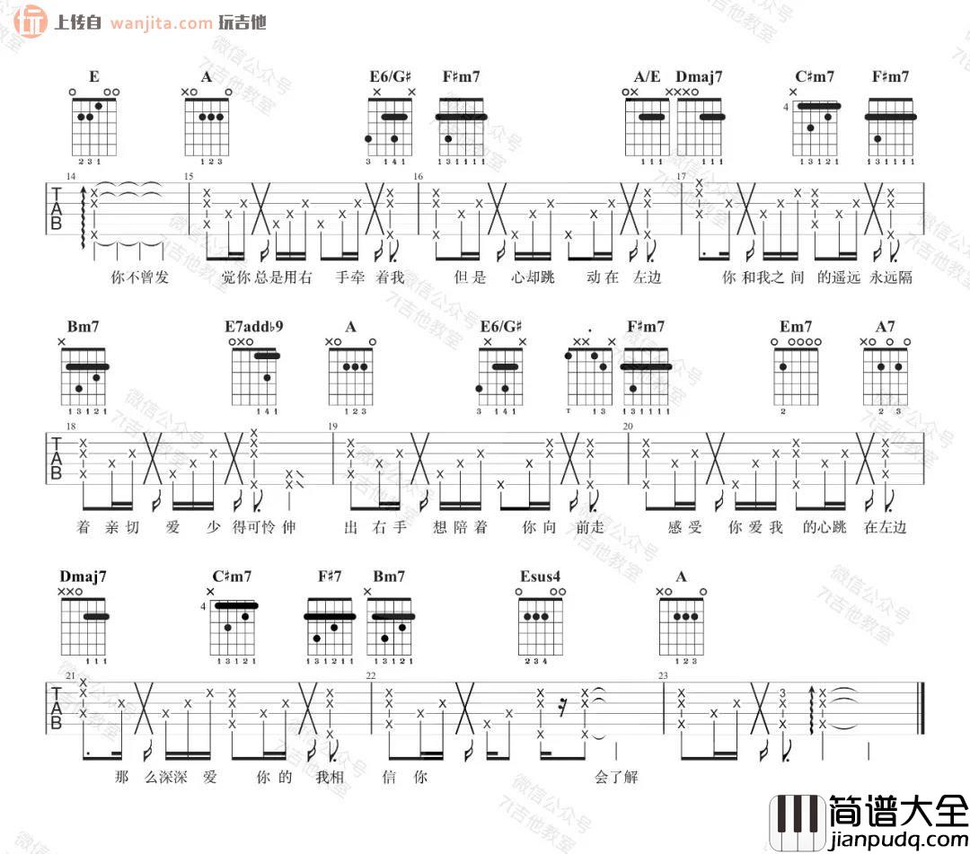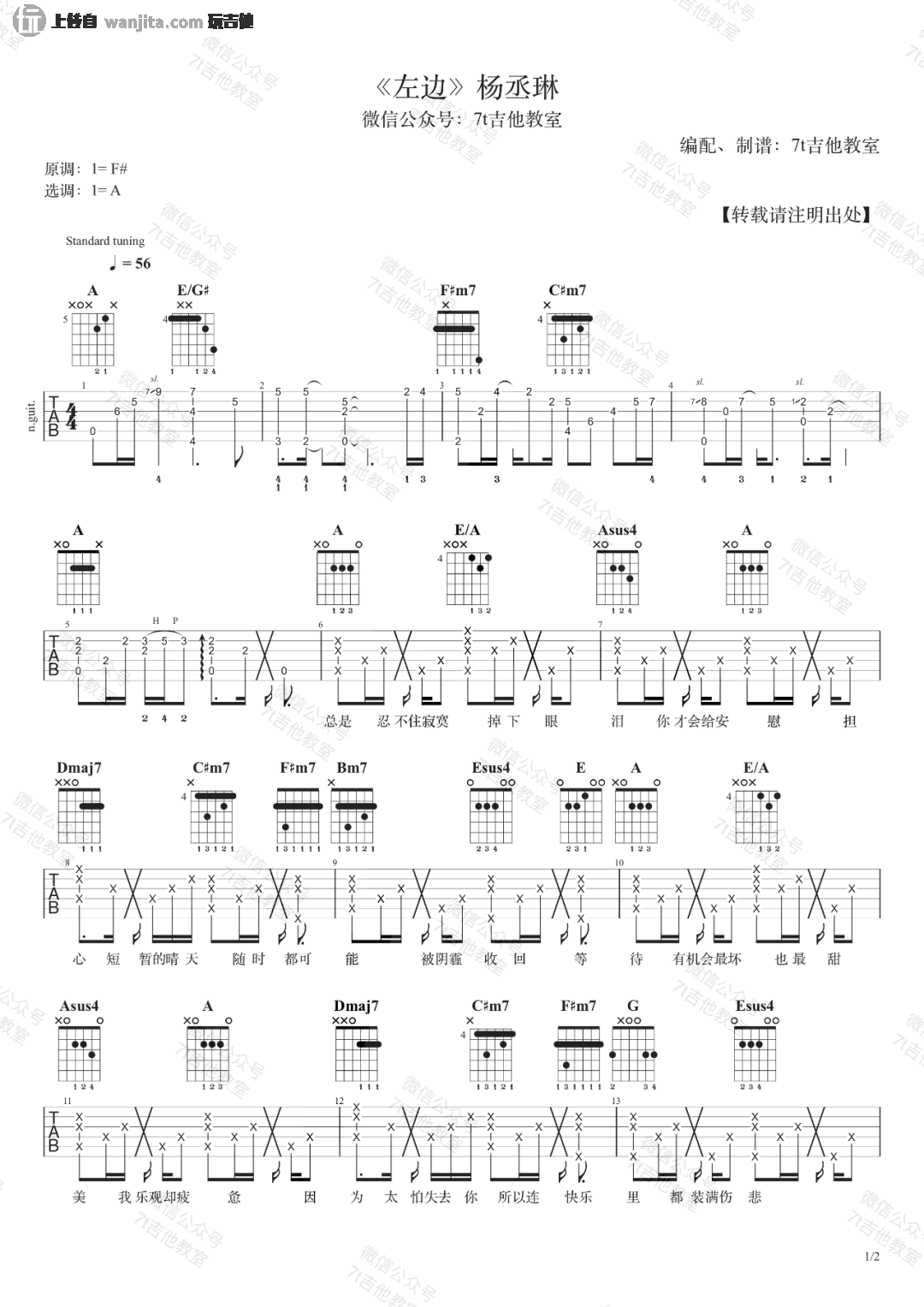 《左边》吉他谱,原调是F#大调,这个谱子选用A大调的指法来编配,视频里是标准音调弦,变调夹夹在第1品,适合音域较低的男生。女生可以比我多夹几品~整首歌尝试了新的弹唱编配方式,融入了拍弦,会让整首歌曲更加生动,下方有相关的弹唱视频示范,朋友们可以先参考。