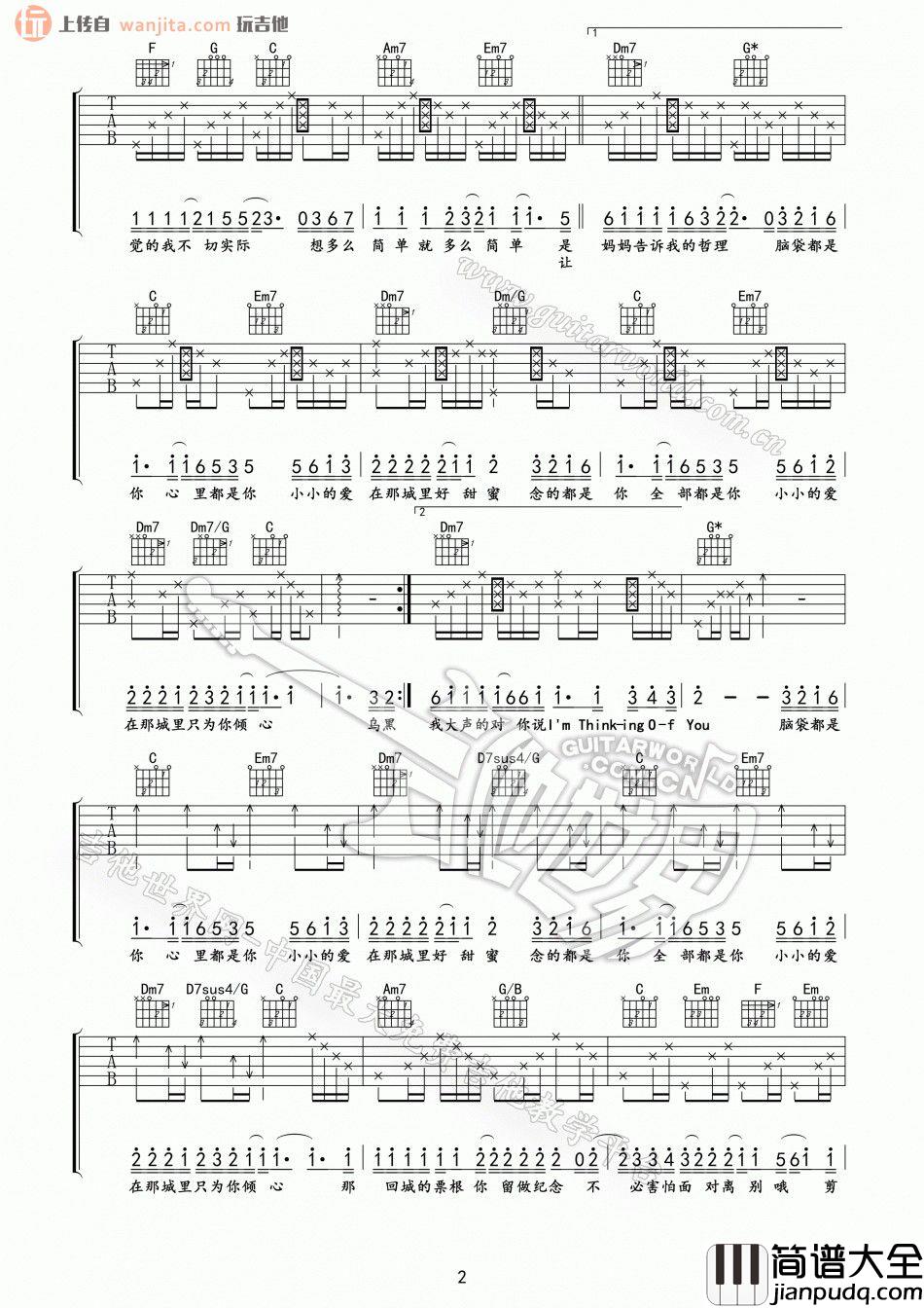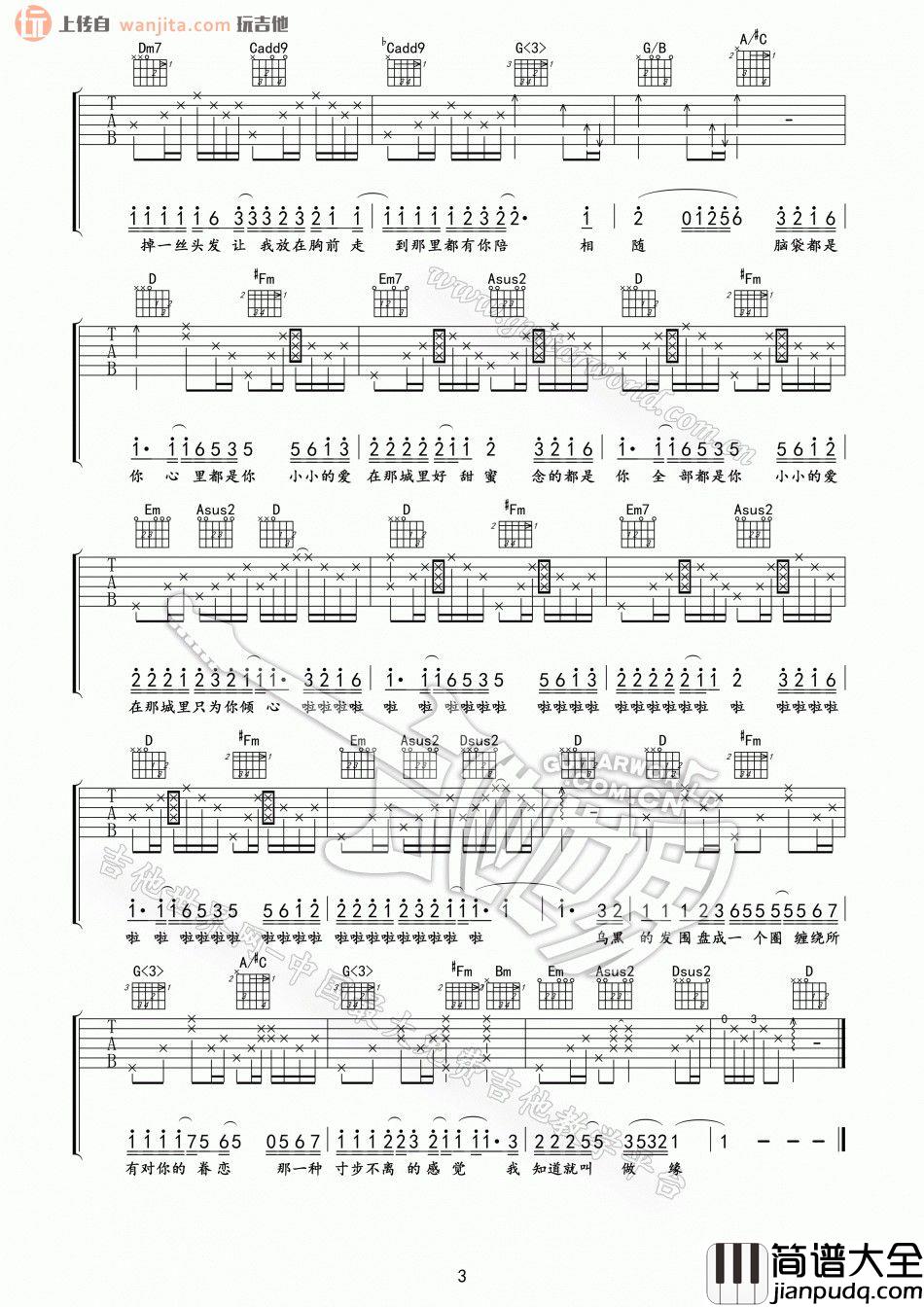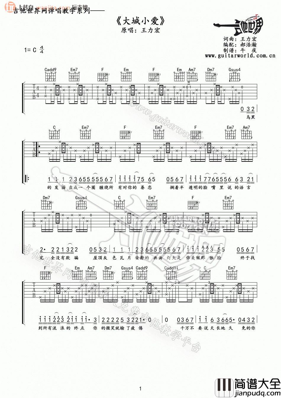 王力宏《大城小爱》吉他谱,由吉他世界编配制谱,总共3张高清图片谱,选用C调指法,节拍4/4拍,不使用变调夹,弹唱难度初级。