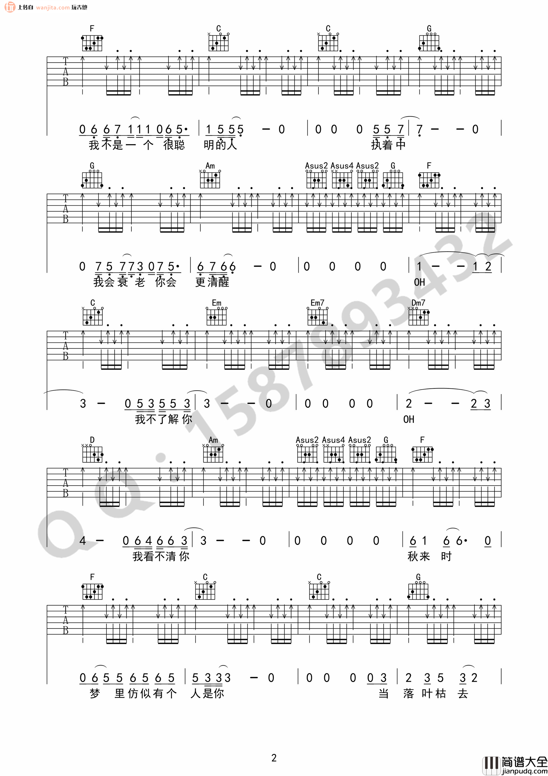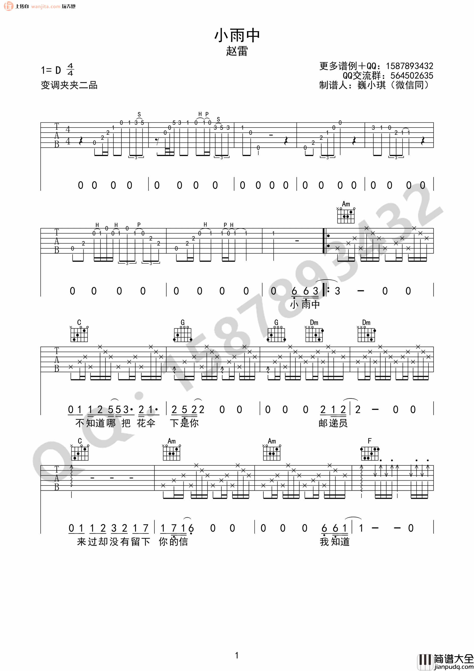 小雨中吉他谱,总共3张高清图片谱,选用D调指法,节拍4/4拍,弹唱建议用变调夹夹2品,弹唱难度初级。
