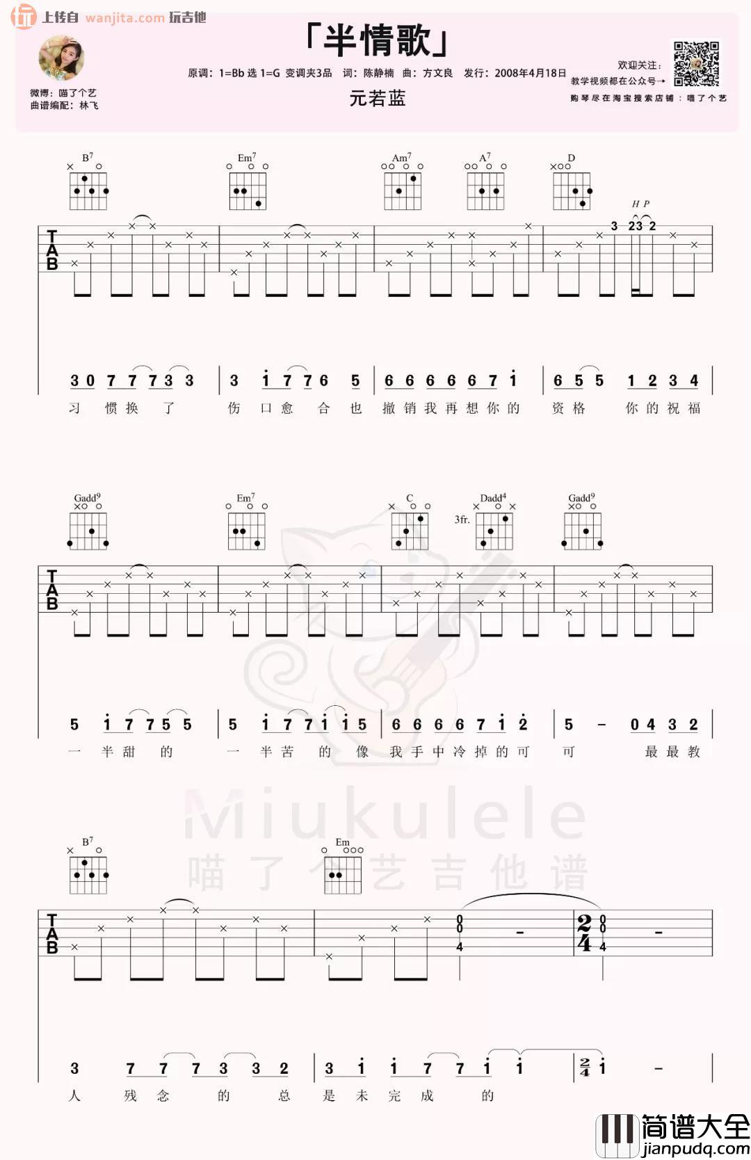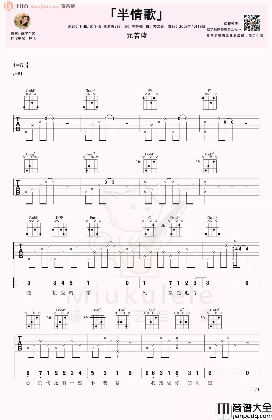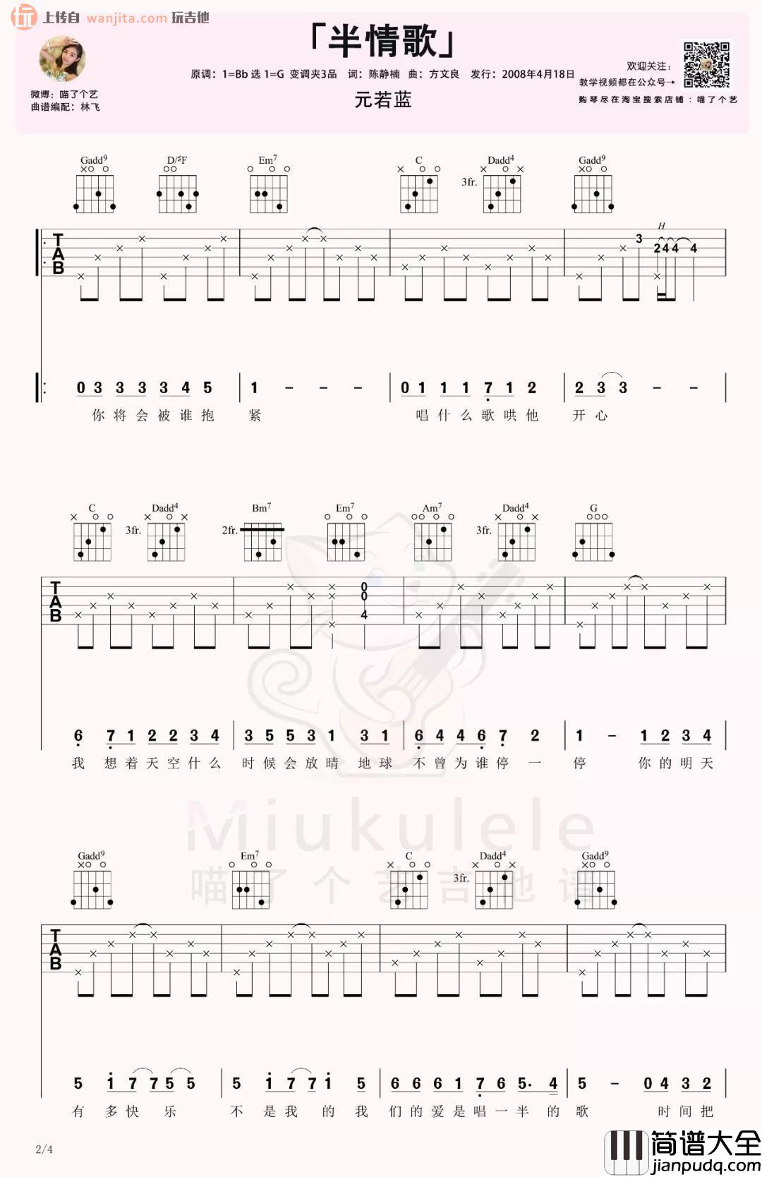 《半情歌》吉他谱,总共是4张高清图片谱,由喵了个艺分享提供,原调是bB,选用G调指法,所以女声的线品,可以按原调弹唱,男声可以尝试不用变调夹,具体还是根据自己音域而定,下方有这首歌的吉他弹唱视频,大家可以优先参考哦。