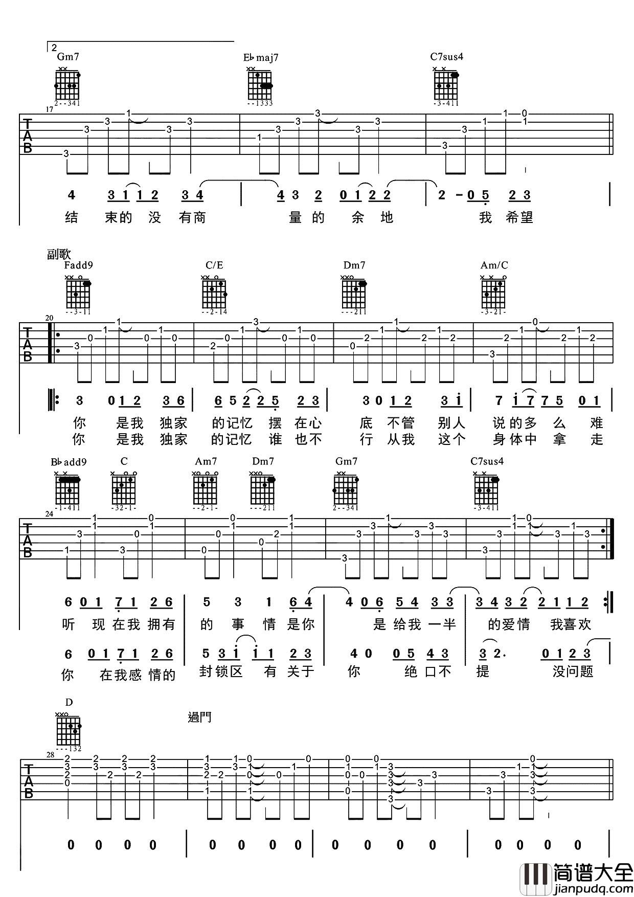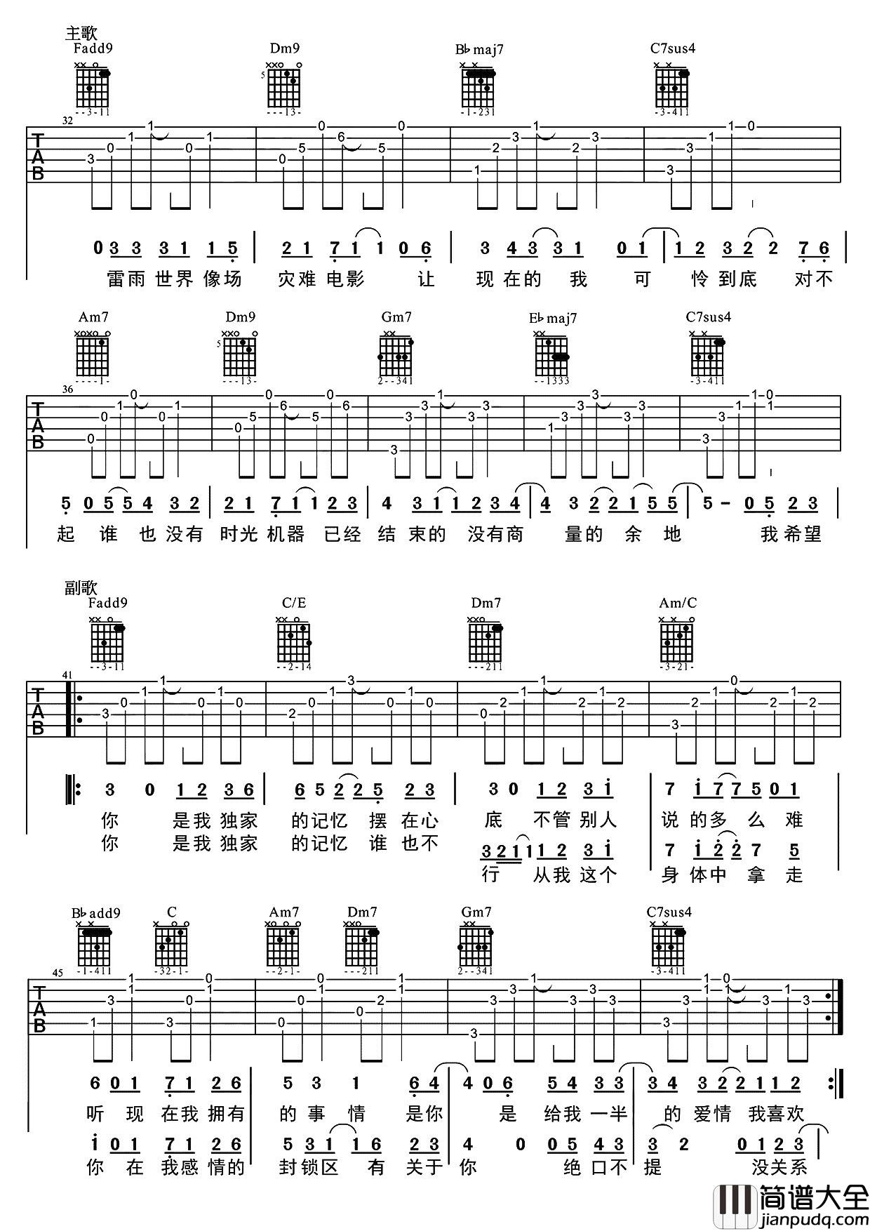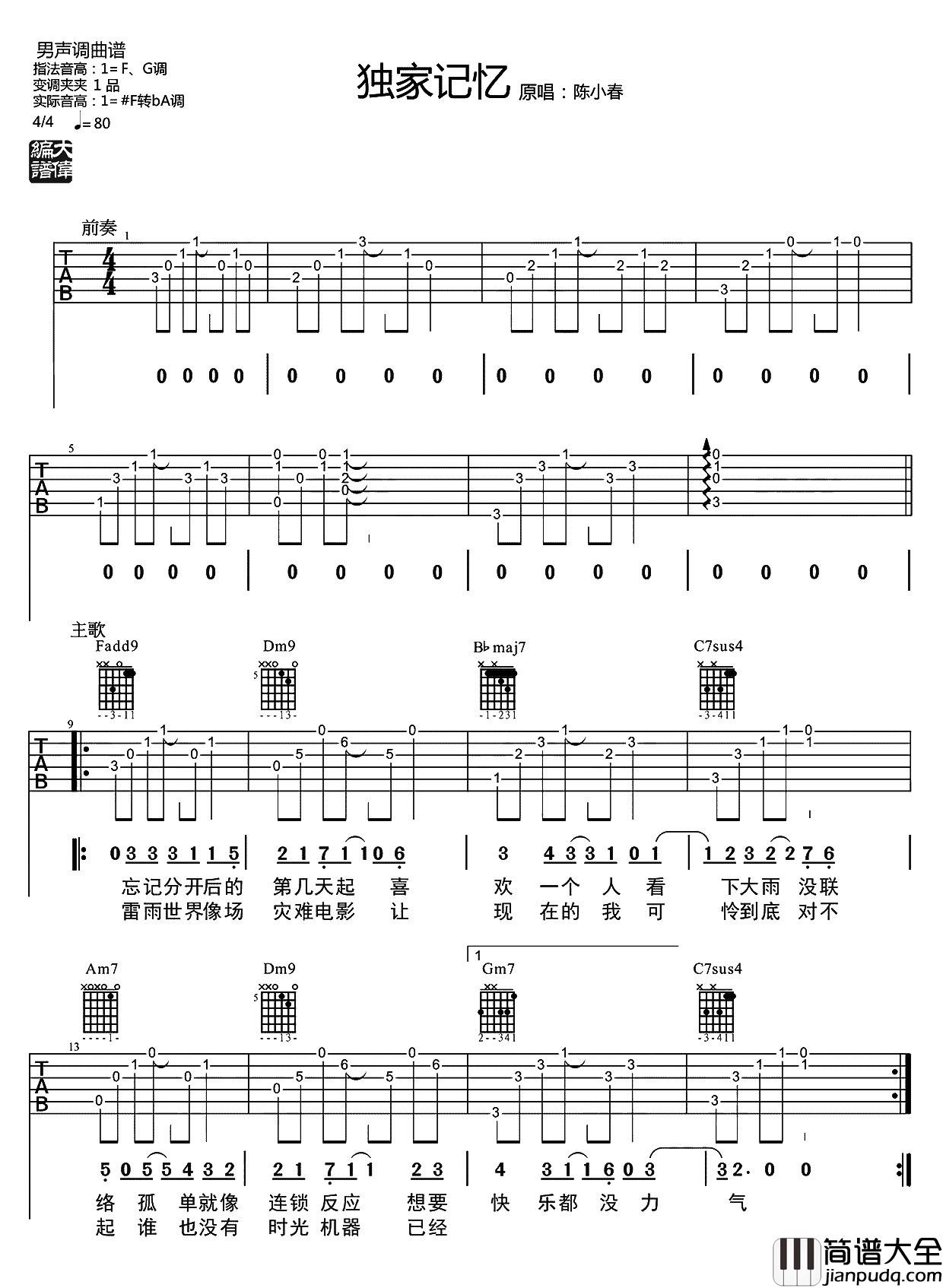 《独家记忆》吉他谱,#F转BA,采用F调和G调指法,变调夹夹1品。这首歌曲难度属于中等,适合进阶练习,大家在学习的时候要注意这首歌地间奏和前奏,一首经典的歌曲值得收藏。