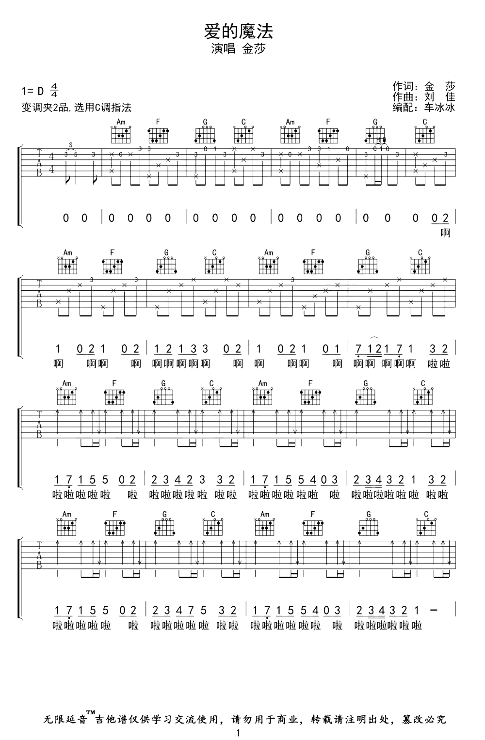 公众号:绵羊乐谱 金莎一首让大家少女心爆发的甜美歌曲,爱的魔法吉他谱,原调D,选用C调指法,变调夹夹二品。《爱的魔法》吉他弹唱谱,三张图片六线谱。 公众号:绵羊乐谱 | 官方QQ群:978773290 不吃独食,学会分享!本文链接:http://www.shaomingyang.com/btb/31268.html 转载请标明出处,尊重原创(๑╹◡╹)ノ。如信息有误或版权疑问,请通过网站底部联系我们会第一时间处理,感谢理解支持(◕ᴗ◕✿)!