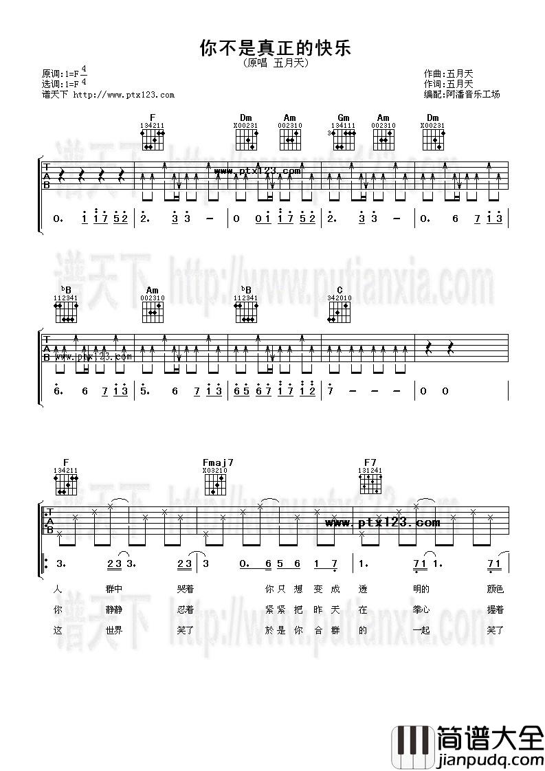 《你不是真正的快乐》吉他谱,总共2张高清图片谱,原调F调,选用F调,节拍4/4拍,不使用变调夹,弹唱难度初级。