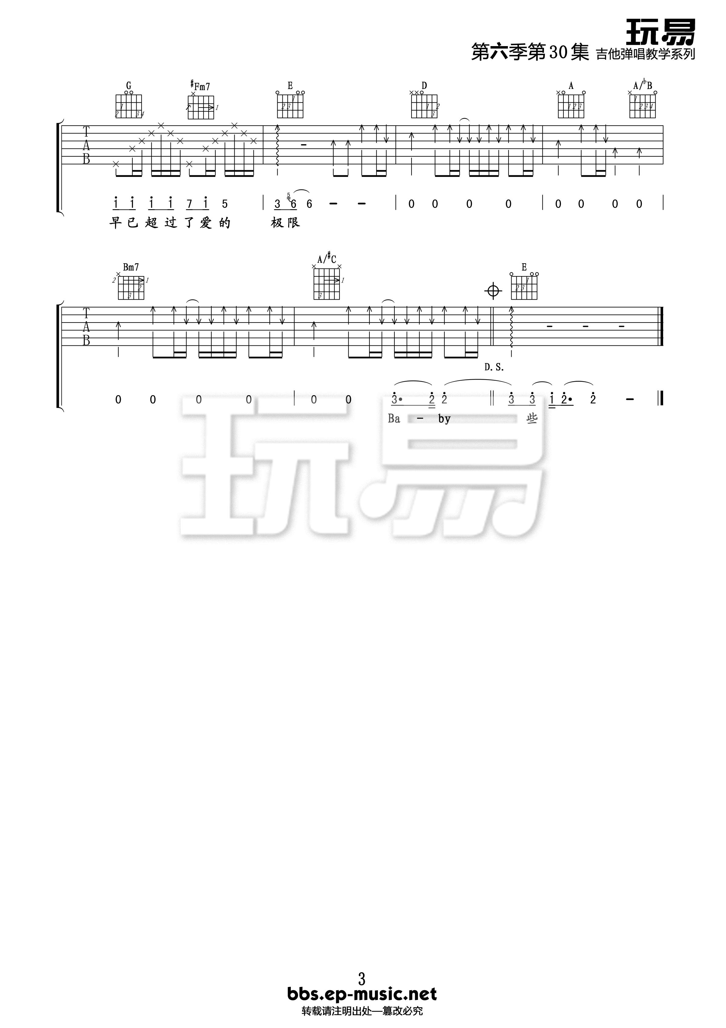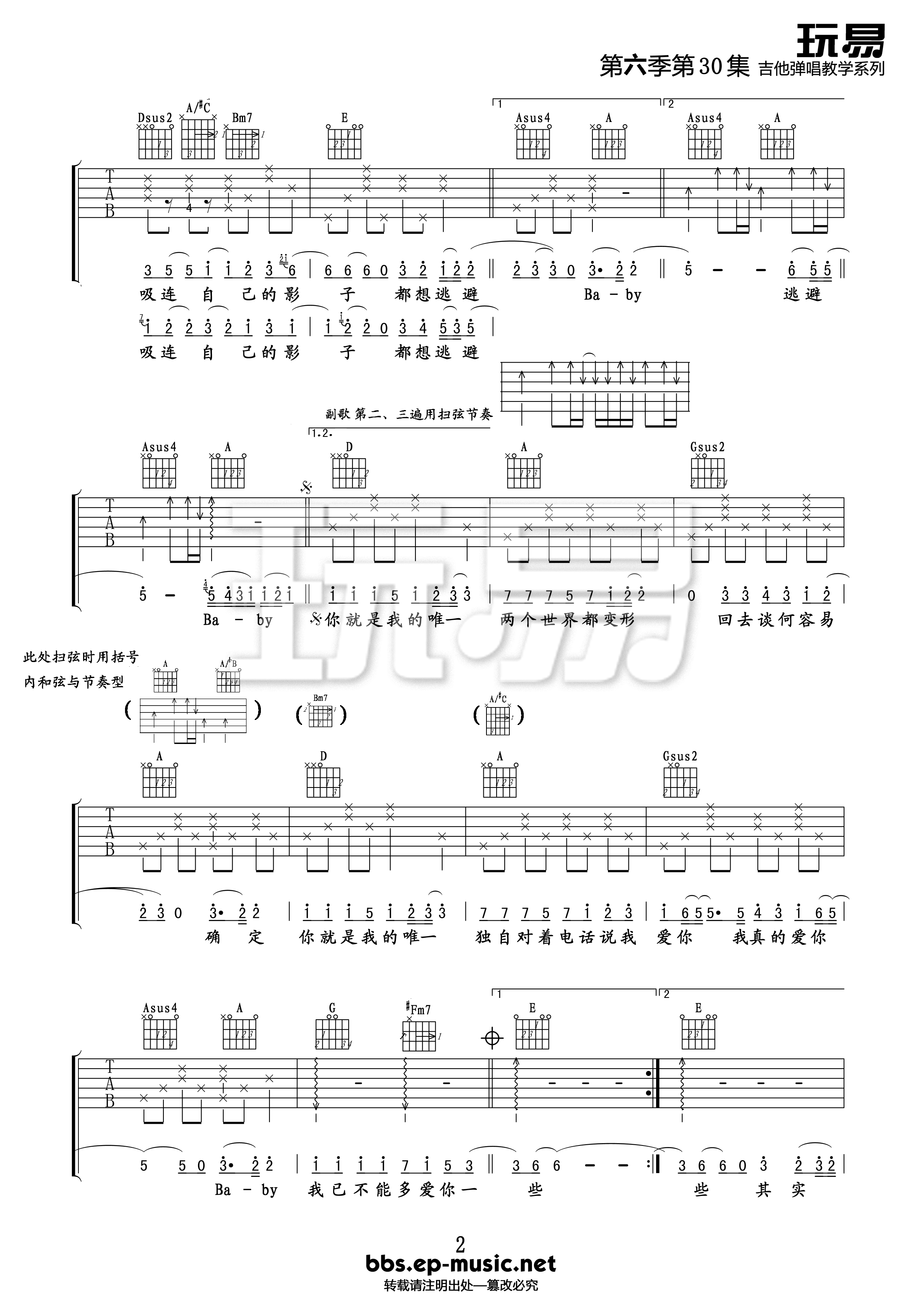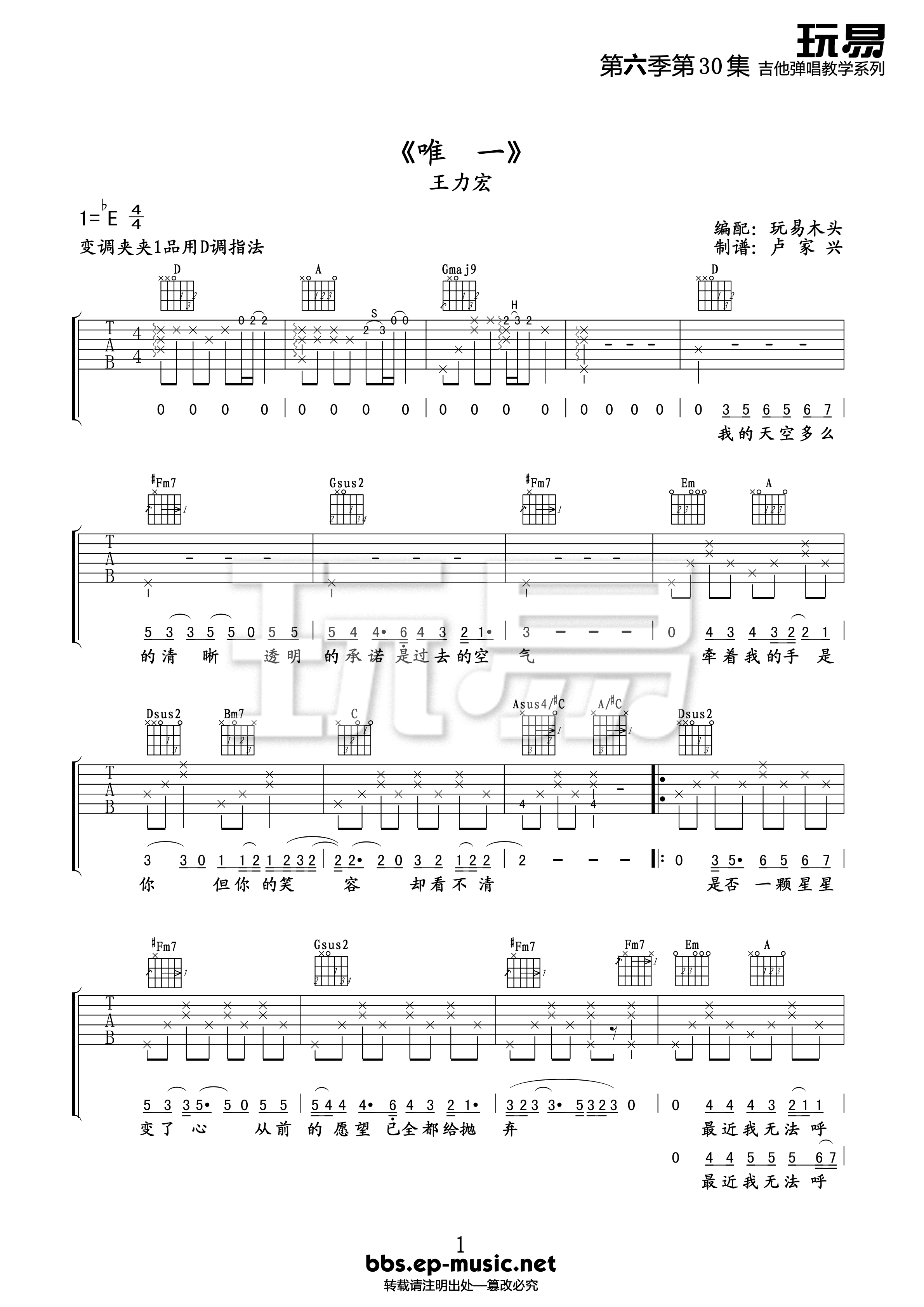 王力宏《唯一》吉他谱,总共3高清图片谱,原调为降E调,用D调指法,节拍4/4拍,建议使用变调夹夹1品,弹唱难度初级。