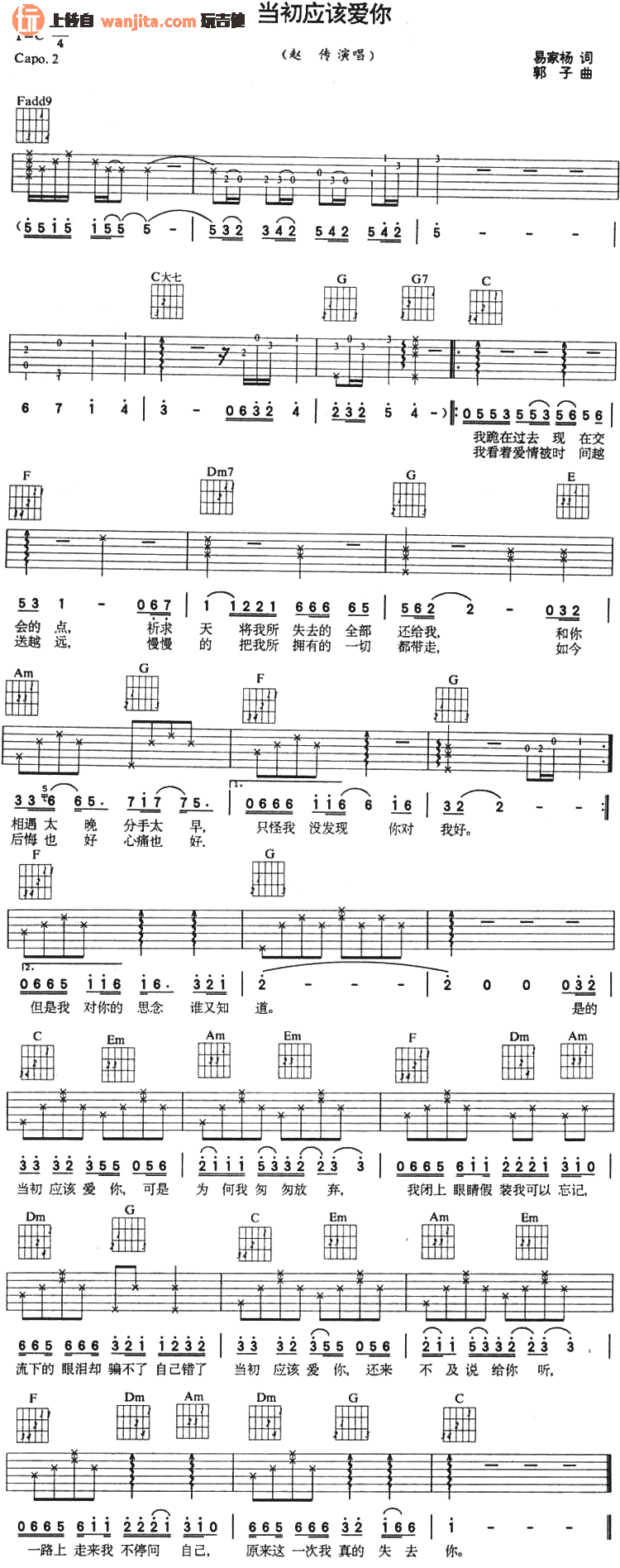 《当初应该爱你》吉他谱,总共1高清图片谱,节拍4/4拍,C调指法编配,原调为D调,变调夹建议夹2品弹唱,弹唱难度初级。
