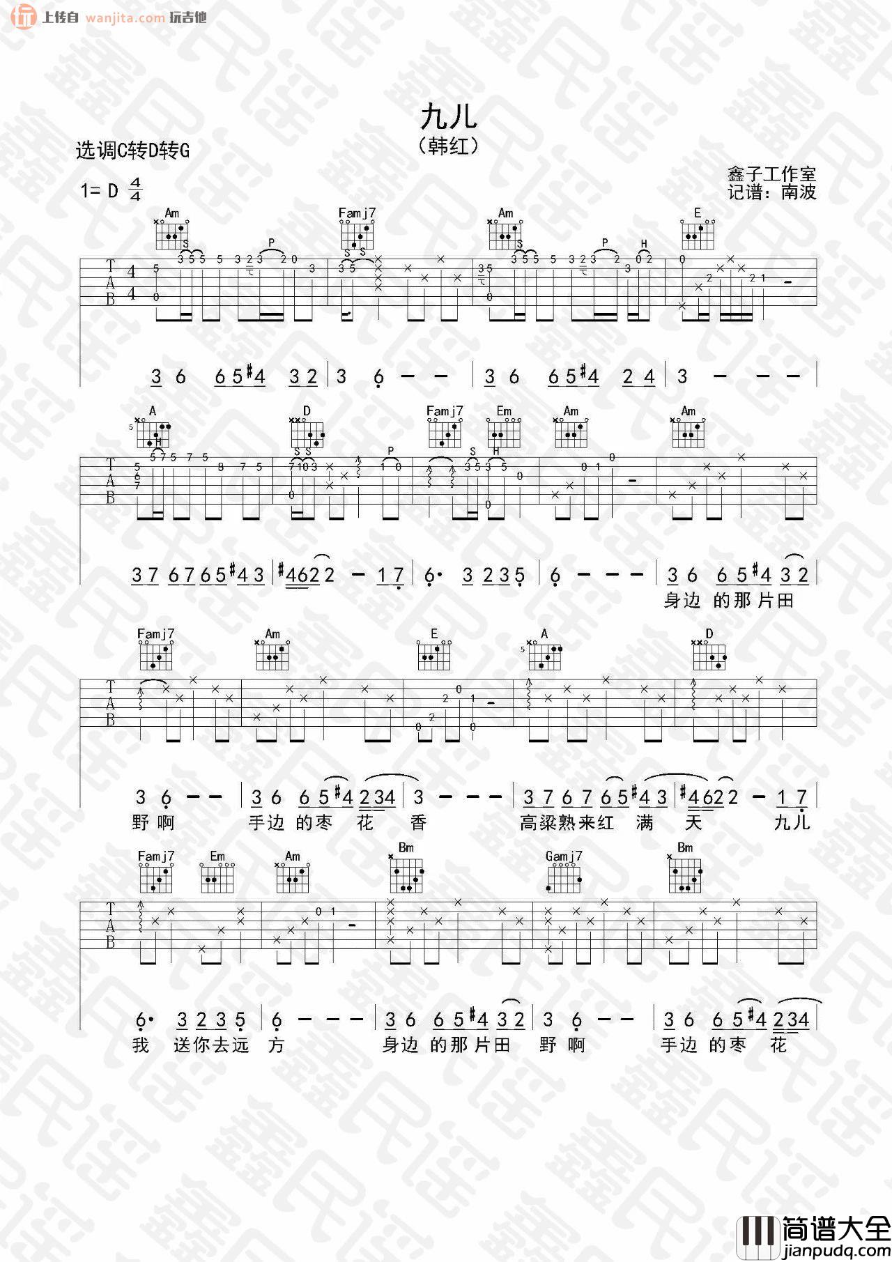 公众号:绵羊乐谱 《九儿》吉他谱,选用C调转D再转G,原调是D调,这个版本由鑫民谣吉他制谱分享,玩吉他整理上传。 公众号:绵羊乐谱 | 官方QQ群:978773290 不吃独食,学会分享!本文链接:http://www.shaomingyang.com/btb/31412.html 转载请标明出处,尊重原创(๑╹◡╹)ノ。如信息有误或版权疑问,请通过网站底部联系我们会第一时间处理,感谢理解支持(◕ᴗ◕✿)!