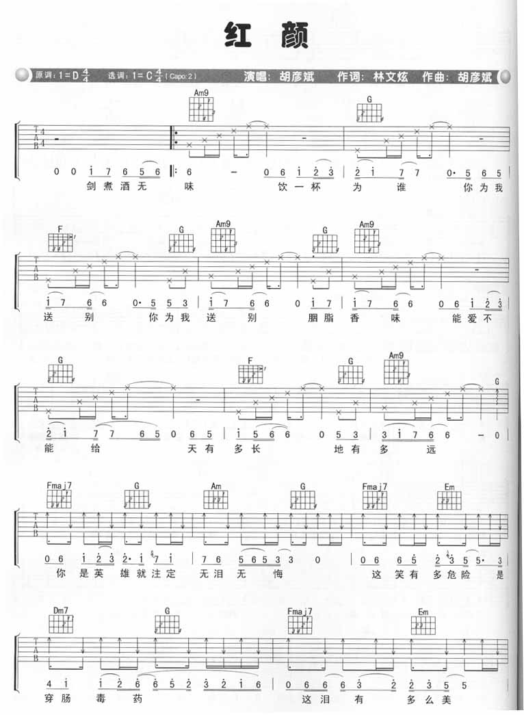 胡彦斌《红颜》吉他谱,共有2张图片谱,原调是D调,选用的C调编配,变调夹可以夹2品弹唱原调,节奏4/4拍,难度较简单。