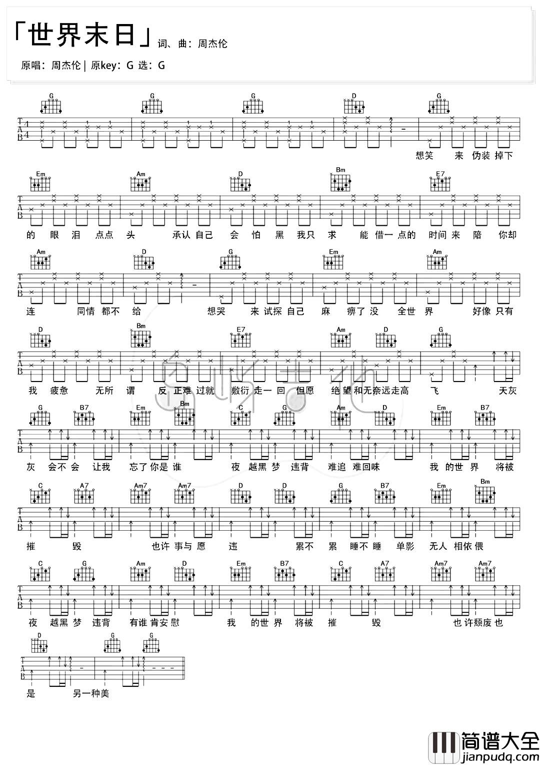 来自岛屿吉他制谱分享的《世界末日》吉他谱【附演示+教学视频】,本谱为G调吉他弹唱谱,原调G调,可不用变调夹标准调音弹唱,随谱附《世界末日》吉他弹唱演示+教学视频,本谱比较适合初学者练习。