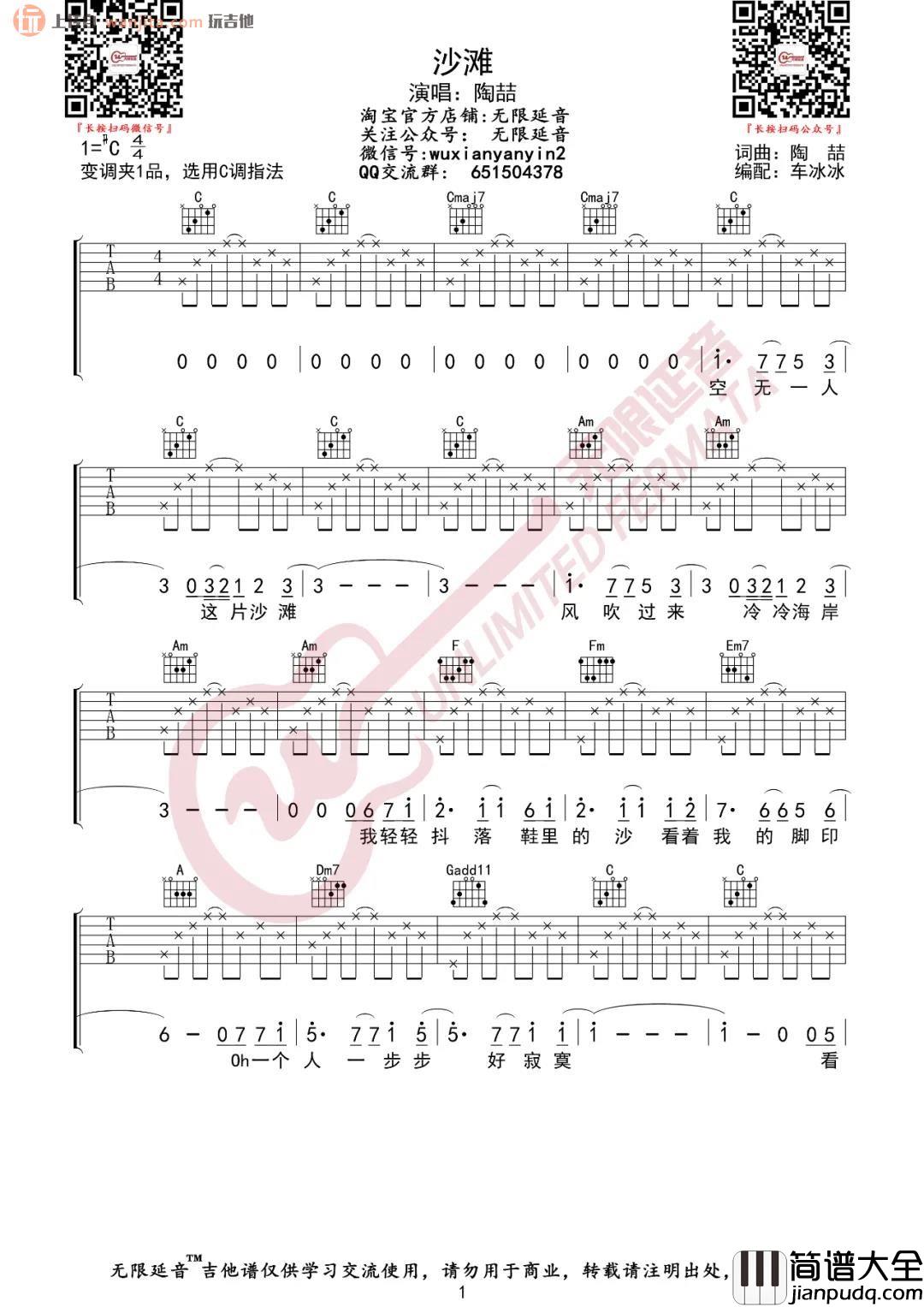 《沙滩》吉他谱,由无限延音制谱,原调是#C,选用的C调指法,变调夹夹1品弹唱原调,分解和弦的方式对新手也十分友好,这首歌不需要太华丽的弹奏,更重要的是完美的弹唱结合,将会是非常好听的作品。
