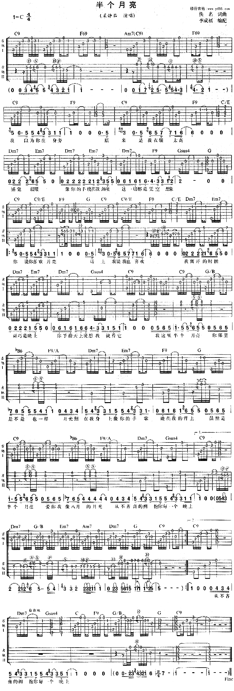梁静茹《半个月亮》吉他谱,总共1张高清图片谱,选用C调指法,节拍4/4拍,不使用变调夹,弹唱难度初级。