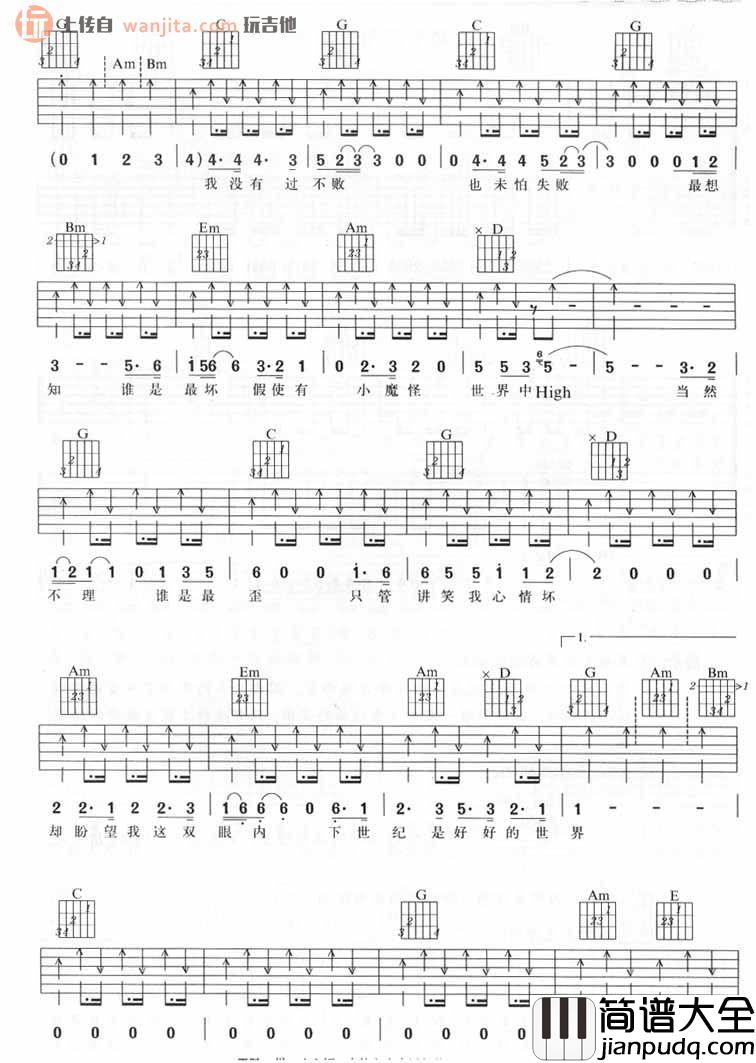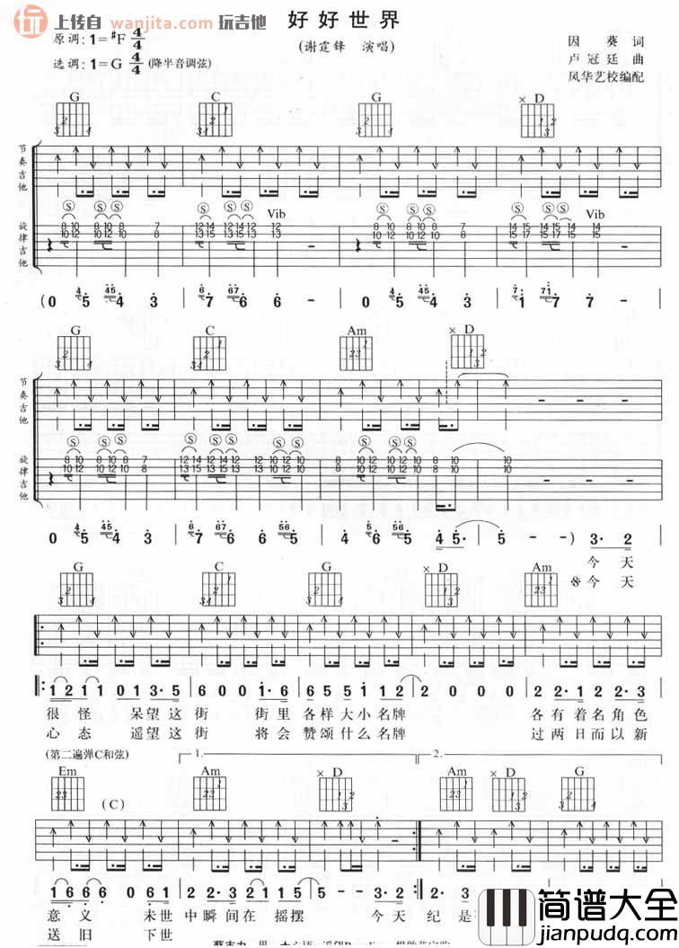 谢霆锋《好好世界》吉他谱,总共3张高清图片谱,原调为升F调,选用G调指法,降半音调弦,节拍4/4拍,不使用变调夹,弹唱难度初级。