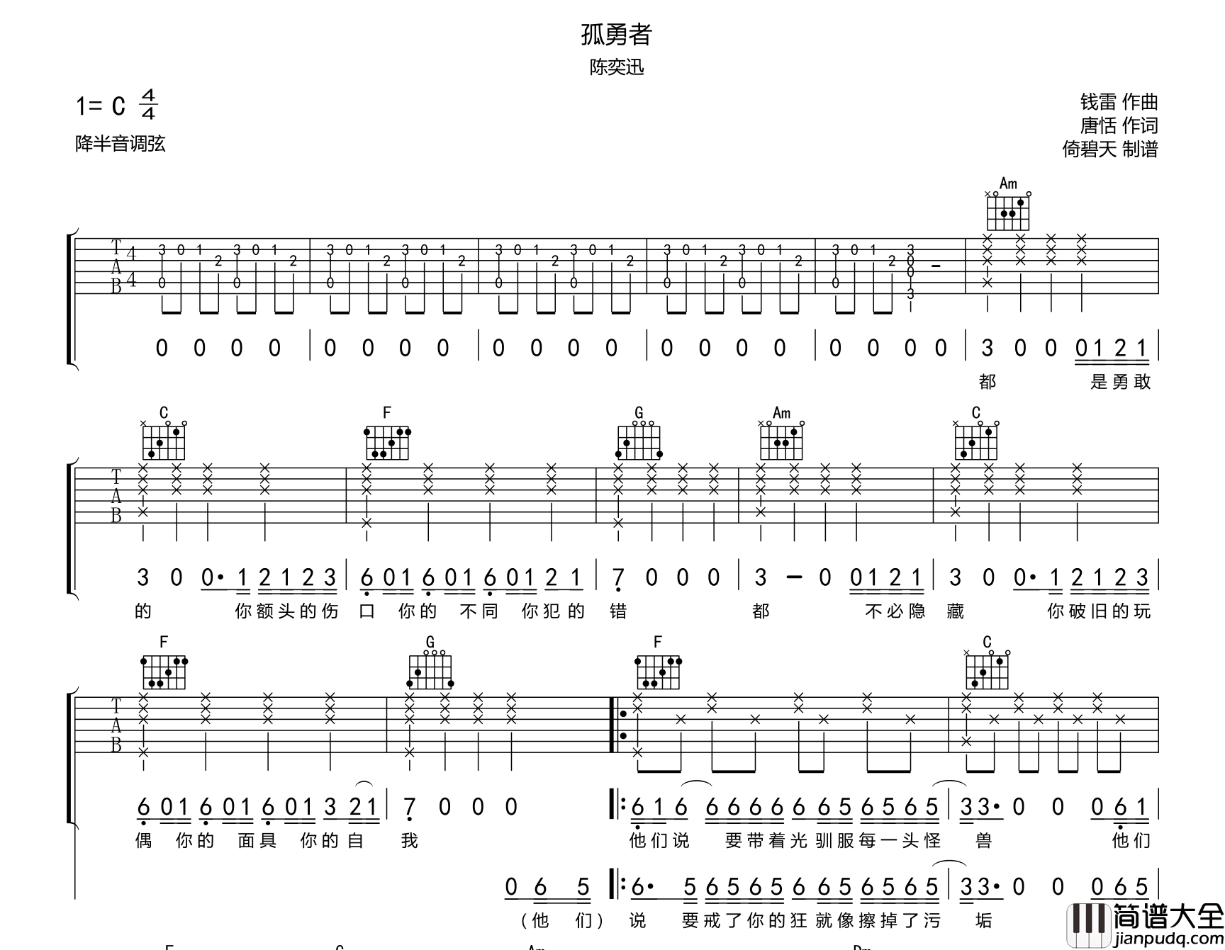 由创作者倚碧天制谱的《孤勇者》吉他谱【女生版附音频】,共有3张高清图片谱例,本谱C调指法编配,唱原调需降半音调弦,女生演唱建议变调夹3品,男低音建议如音频所示变调夹5品,节奏4/4拍,难度较简单。
