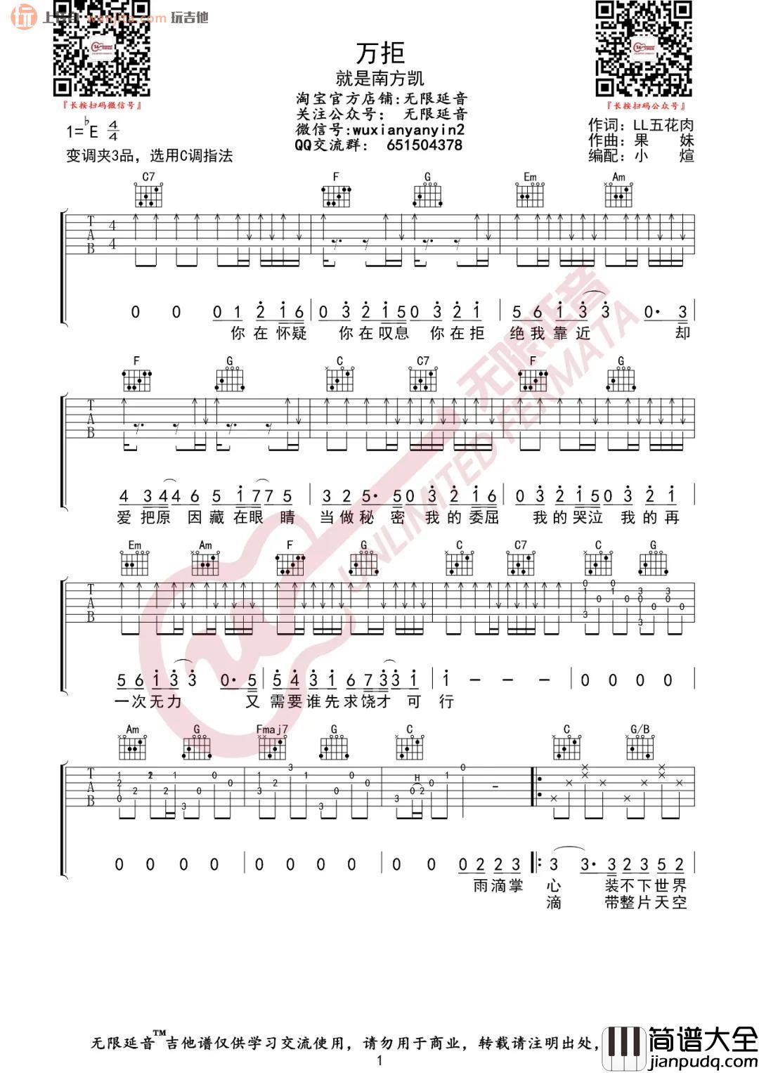 《万拒》吉他谱,原调是bE调,选用C调指法编配,弹唱的副歌部分主要以扫弦节奏为主,另外部分是半分解和弦弹唱,喜欢的朋友可以练习一下这首曲谱的版本。