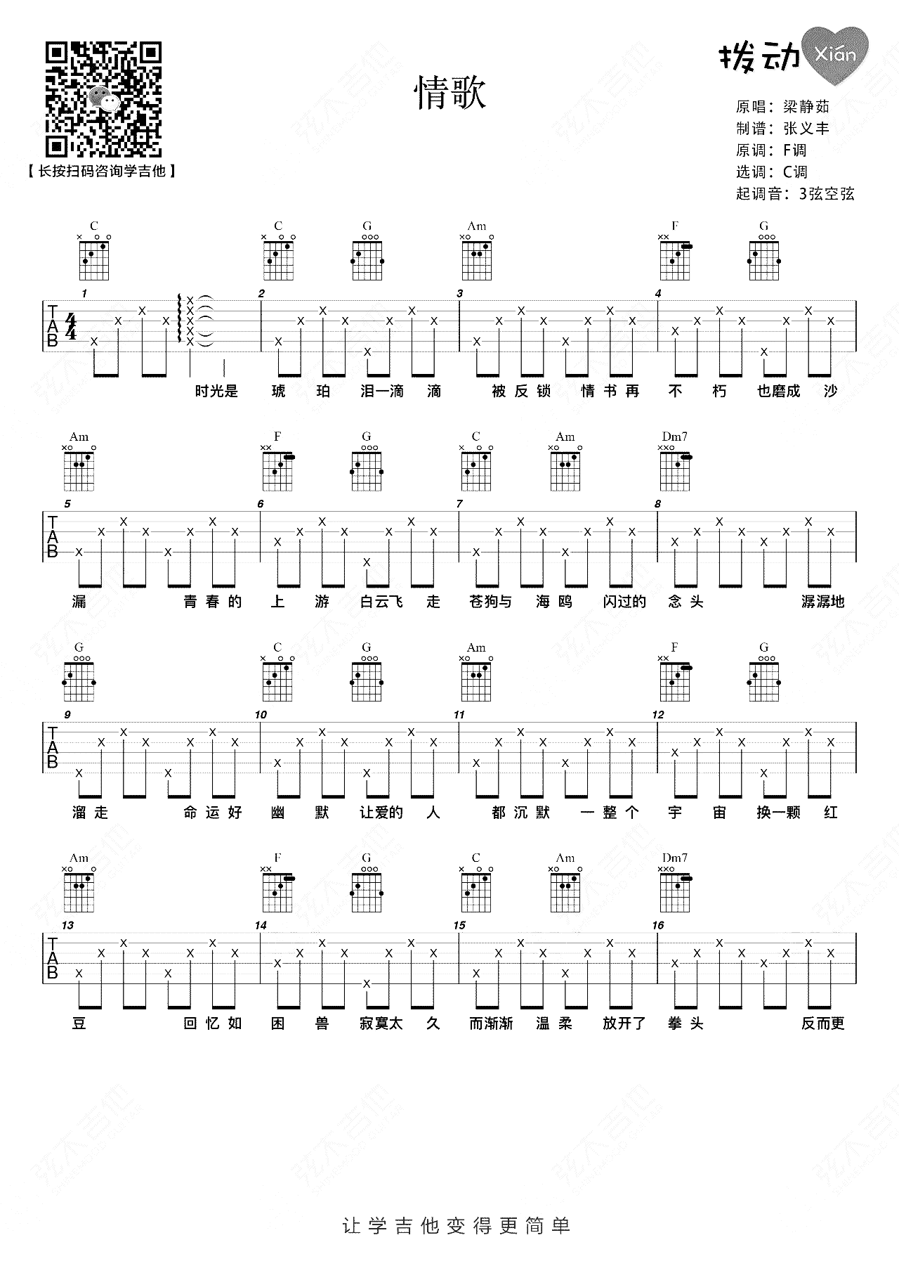 梁静茹《情歌》吉他谱,由弦木音乐制谱,总共2张高清图片谱,弹唱十分的简单,最基础的分解和弦,但是不影响和弦的准确性,感兴趣的不妨跟着吉他弹唱视频先试试吧,如果觉得想挑战更高难度,可以选择这首歌的其他版本。
