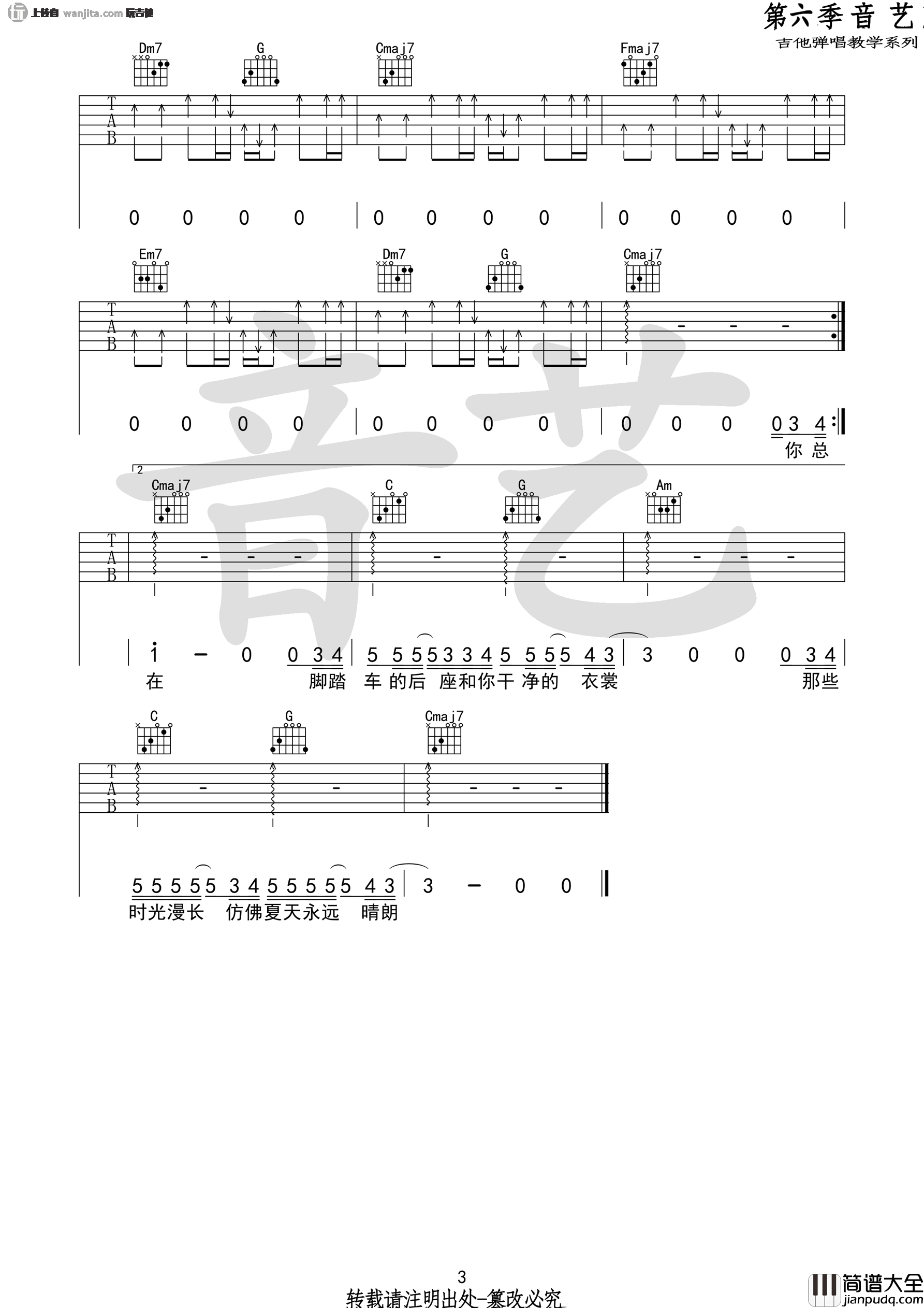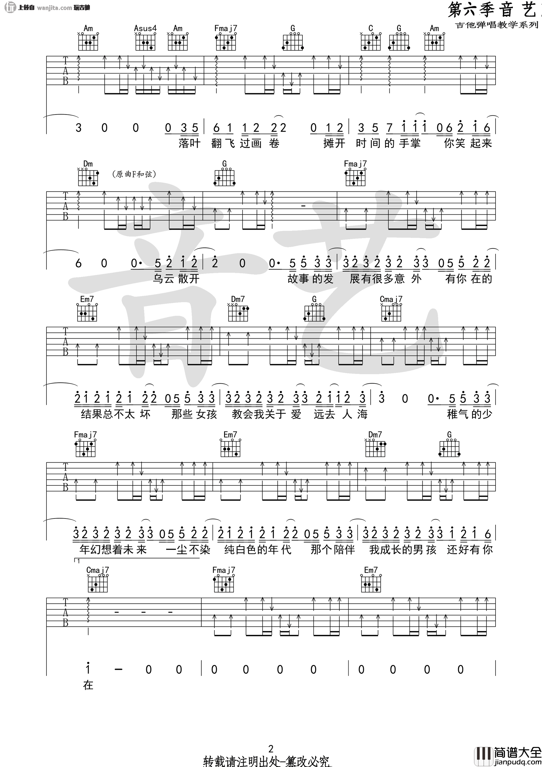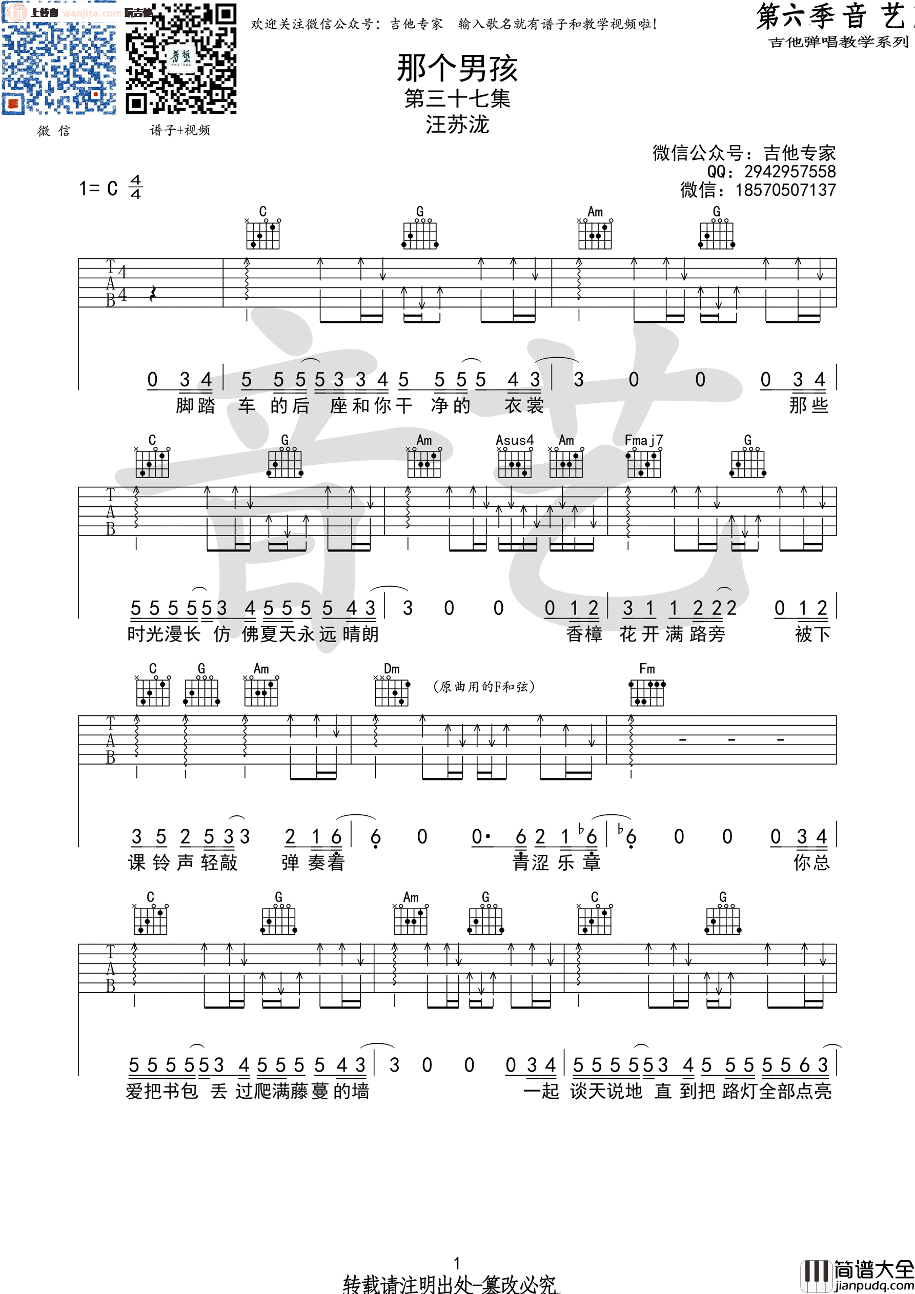 《那个男孩》吉他谱,原调C调,不使用变调夹。整张曲谱都通过扫弦来创造节奏,整首歌曲轻快的节奏很适合朋友们一起玩,比较简单的一张谱子,适合新手学习练习。总共3张高清图片谱例,由吉他专家制谱分享。