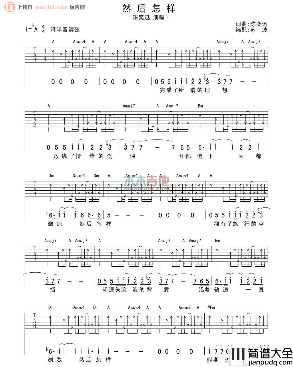 《然后怎样》吉他谱,总共2张高清图片谱,原调为降A调,节拍4/4拍,降半音调弦,不使用变调夹,弹唱难度一般。