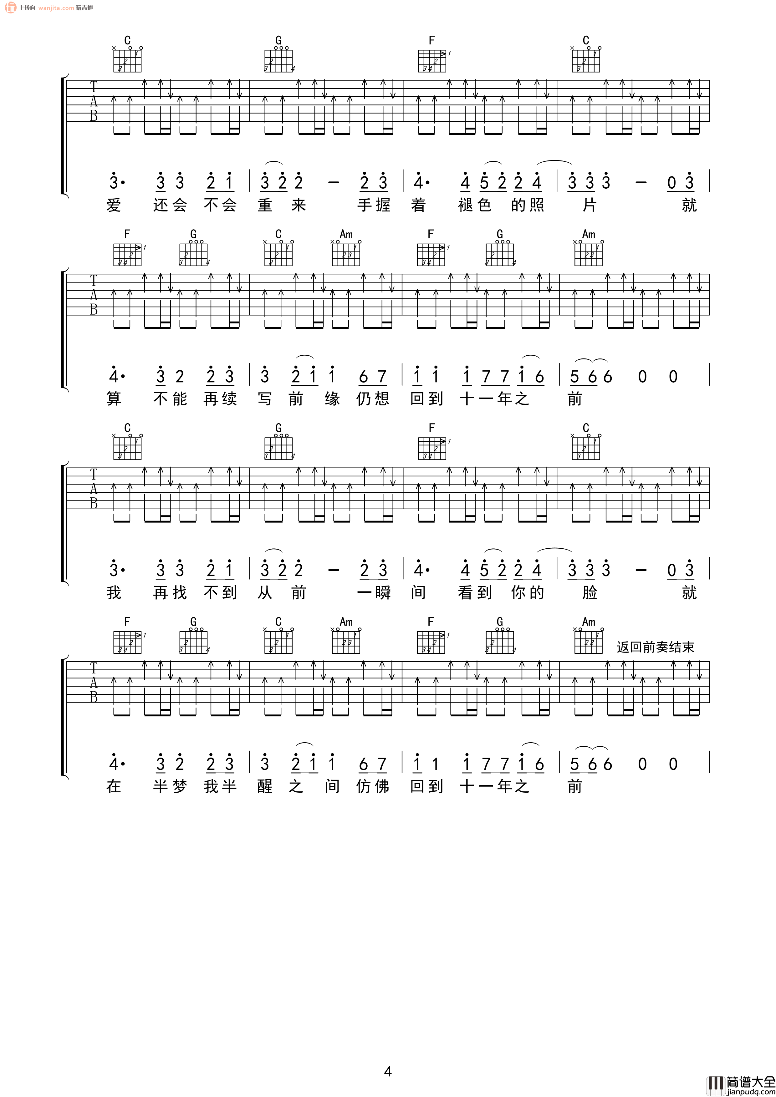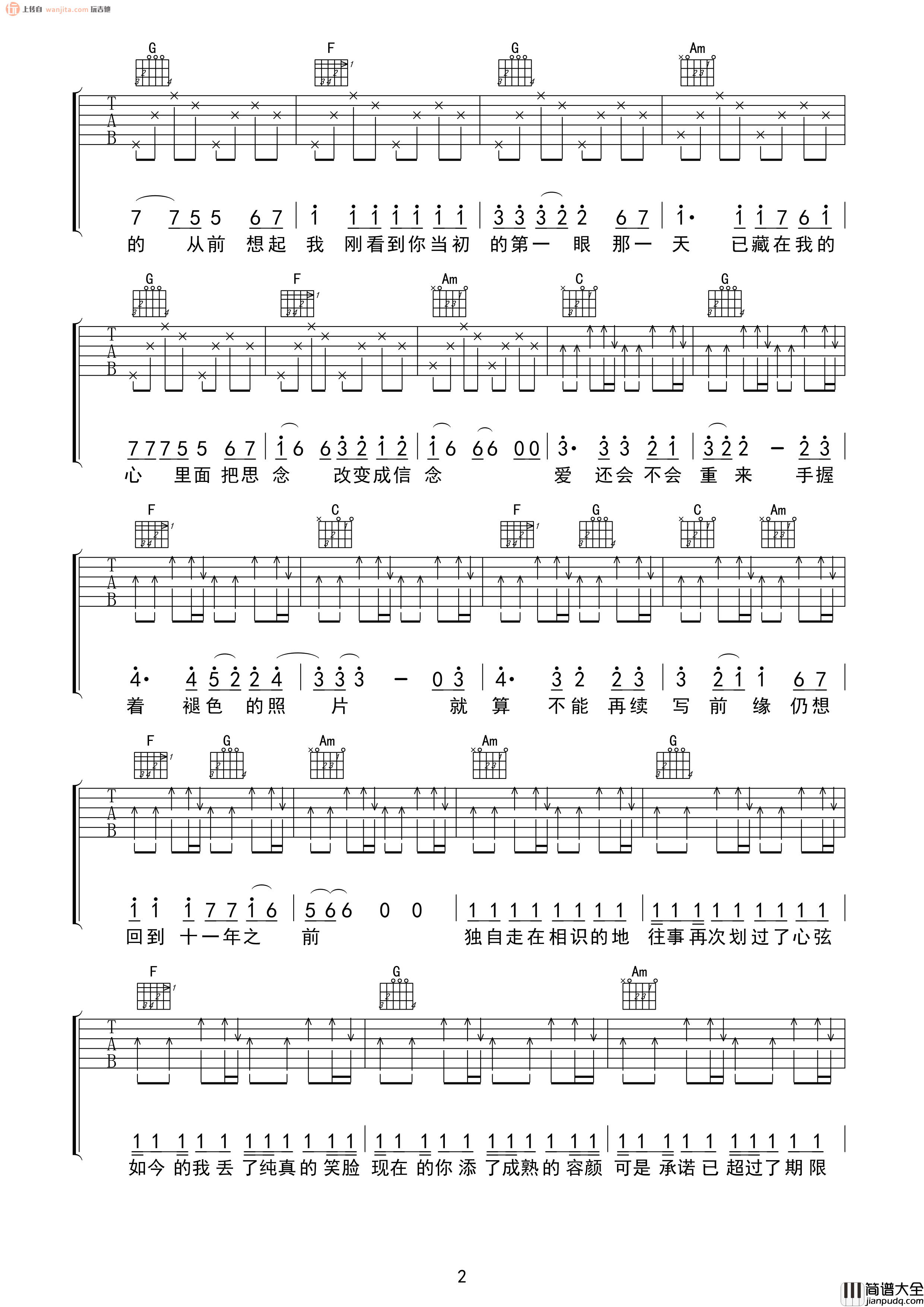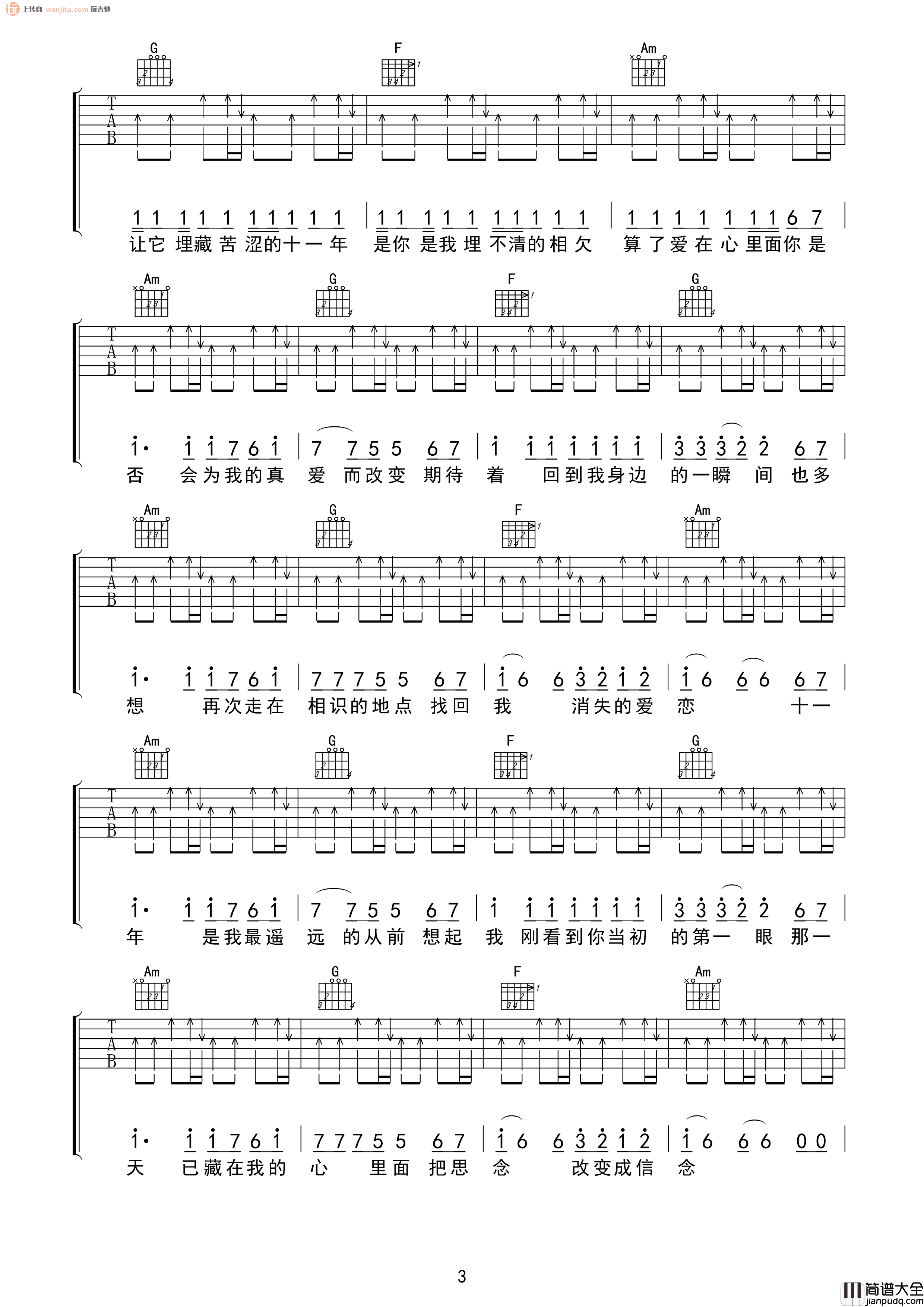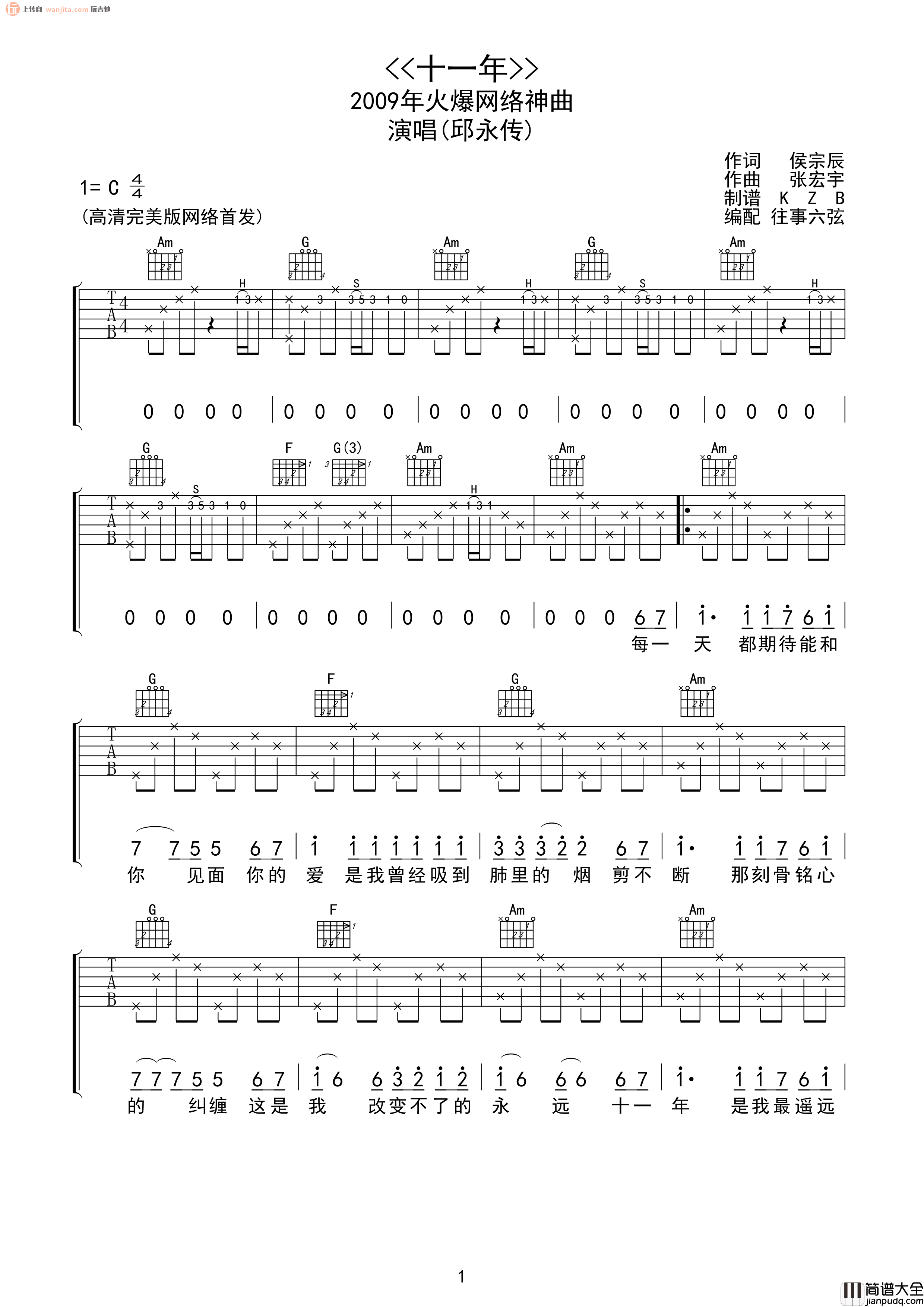 《十一年》吉他谱,选用C调编配,由KZB制谱,难度不算很大,主要以分解和弦为主,副歌扫弦弹唱会让歌曲更加的有层次感而动人。