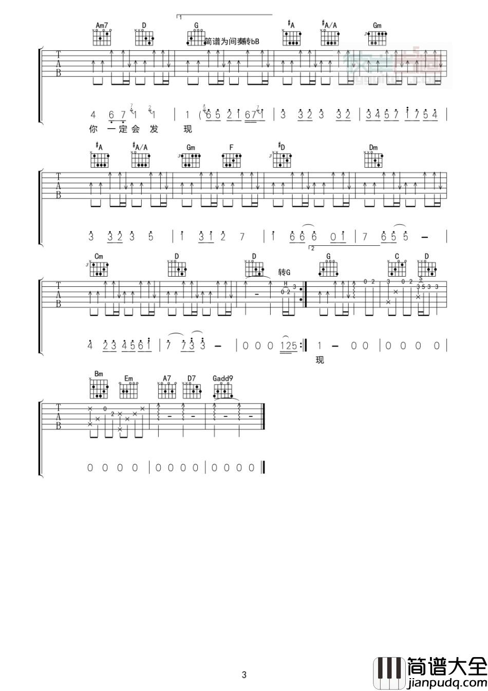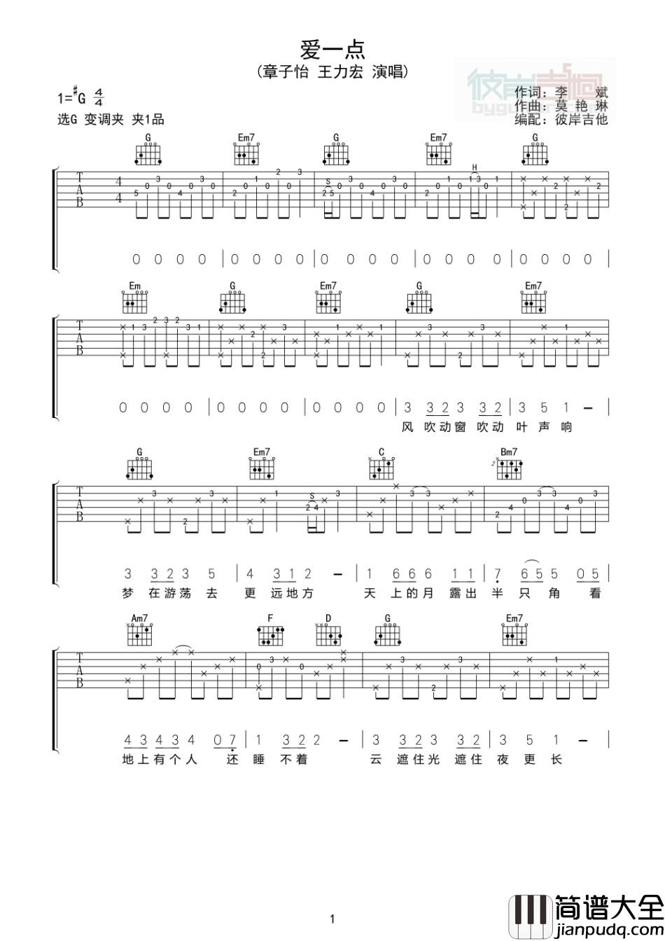 《爱一点》吉他谱,总共3高清图片谱,原调为升G调,选用G调指法,节拍4/4拍,建议使用变调夹夹1品,弹唱难度初级。
