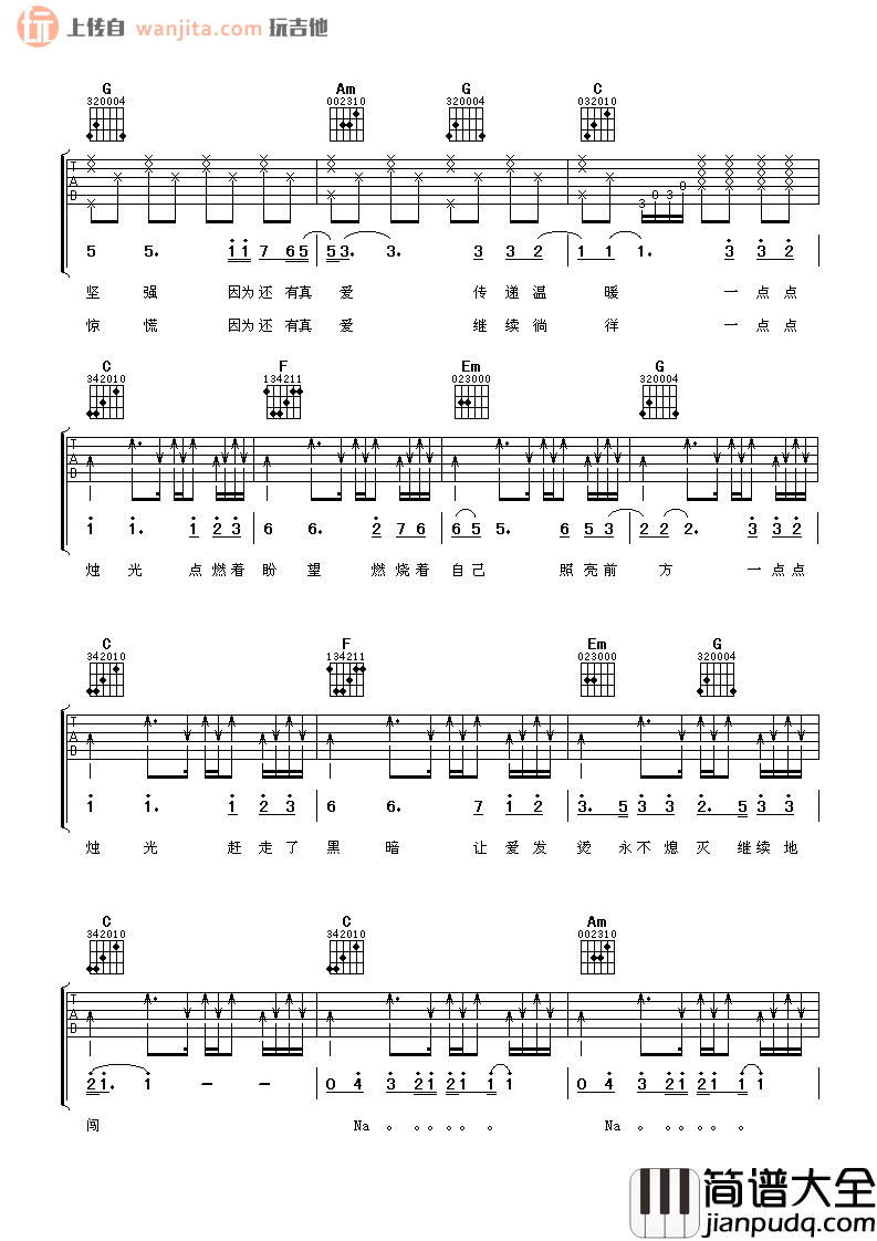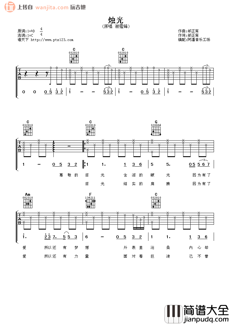 谢霆锋《烛光》吉他谱,总共3张高清图片谱,原调为降D调,选用C调指法,节拍4/4拍,不使用变调夹,弹唱难度初级。