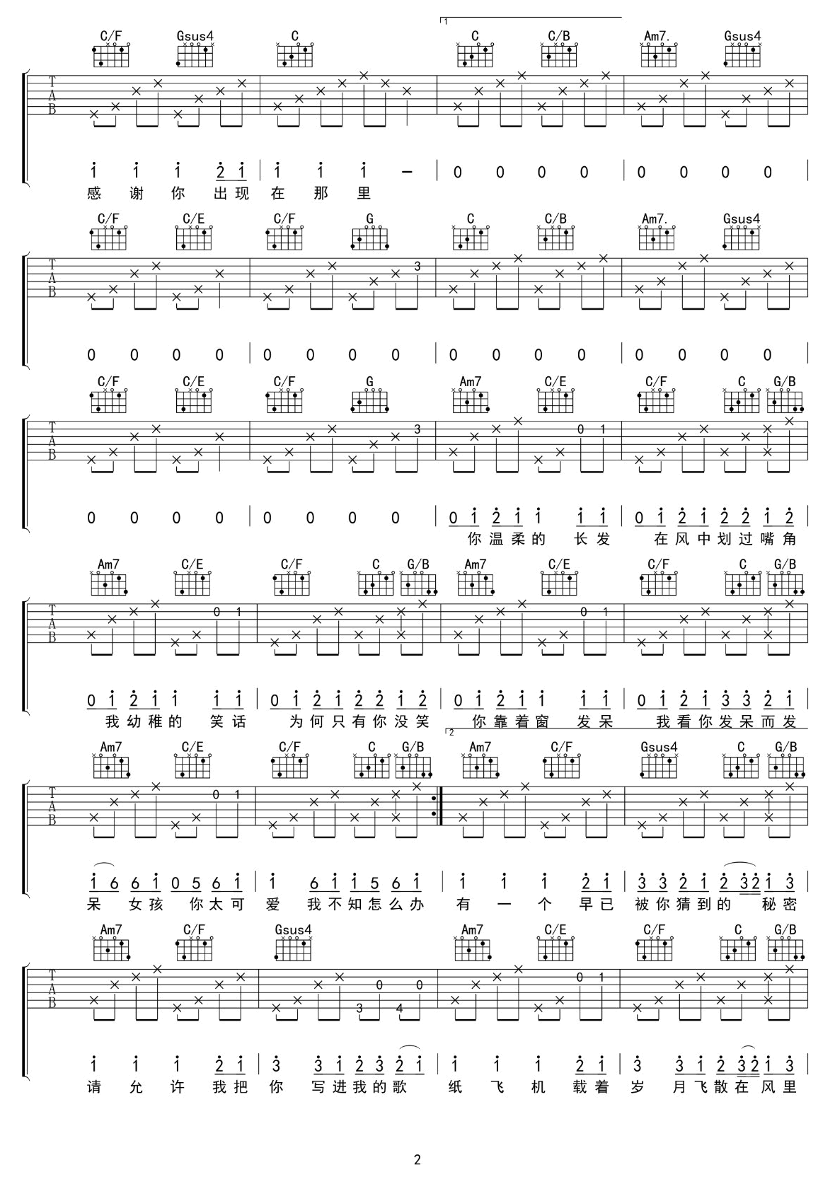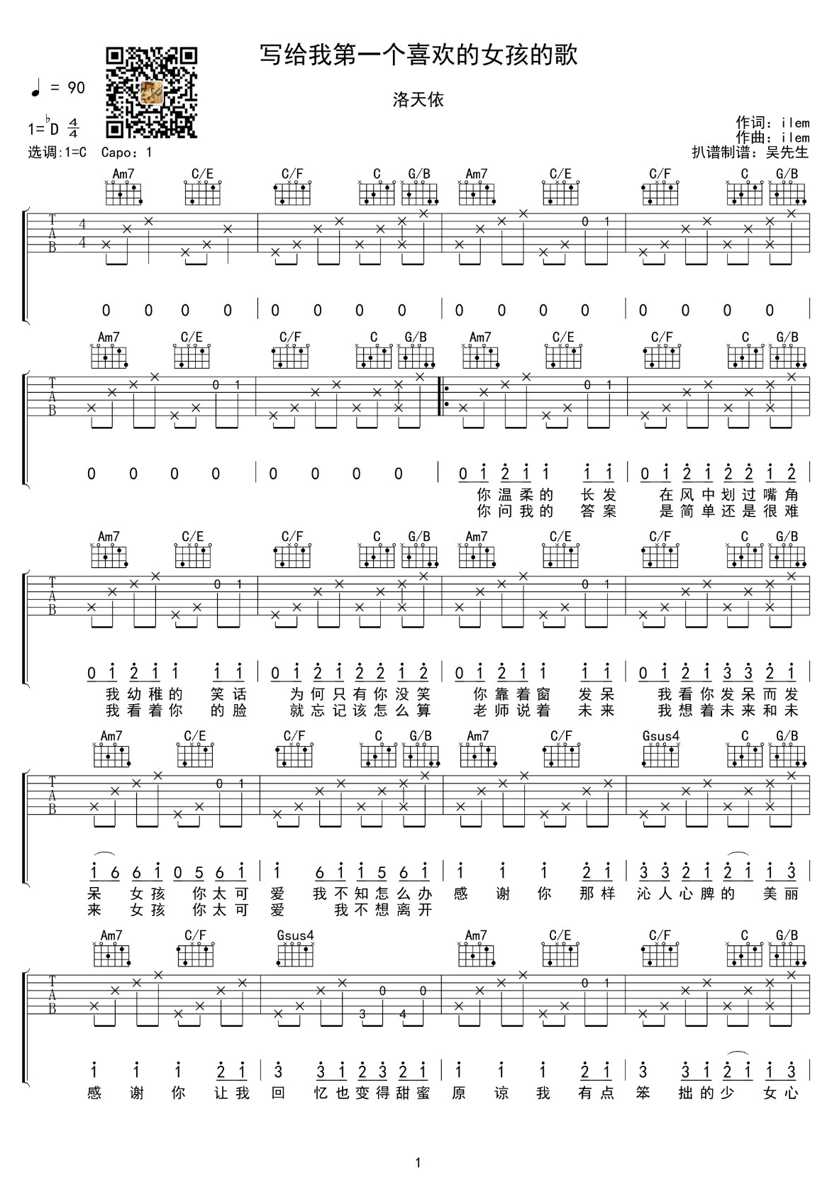 《写给我第一个喜欢的女孩的歌》吉他谱,由吴先生制谱分享,选用C调编配,全程和弦变化不大,分解和弦的方式贯穿整首歌曲,总共3张高清图片谱,由玩吉他整理后上传,喜欢的朋友赶紧试试哦。