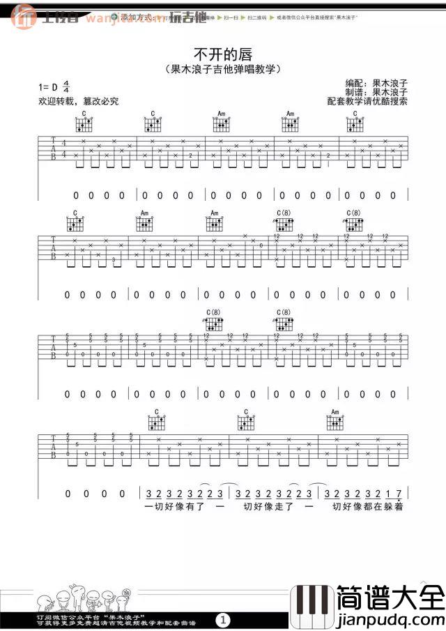 《不开的唇》吉他谱,原调D调,不使用变调,果木浪子编配制谱。整首歌曲谱曲不算难,适合新手学习练习。但是,大家在练习的时候要注意歌曲的情绪起伏,一首好听的民谣歌曲记得收藏。