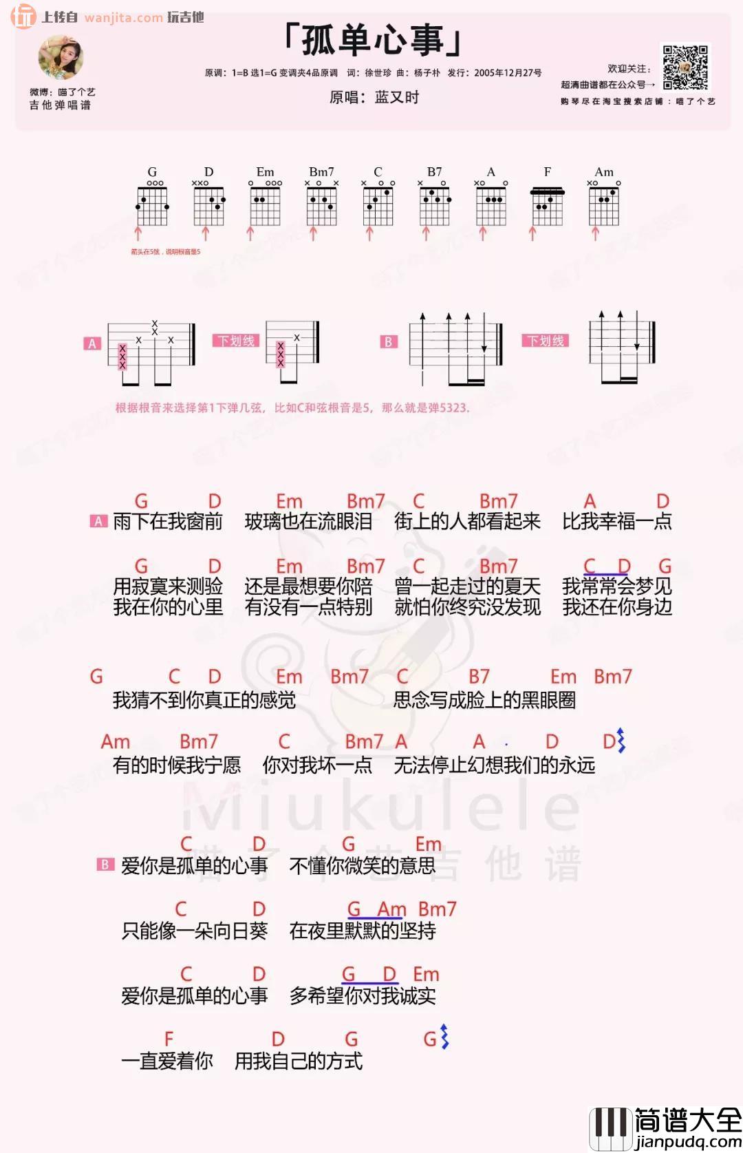 《孤单心事》吉他谱,由喵了个艺分享,这个版本是按照原版的标准扒带,相对来说有一些简化原调是B调,选用G调指法编配,具体弹奏的演示大家可以参考下方小姐姐的视频。曲谱是简单的和弦谱,标注了固定的节奏和和弦部分的说明。