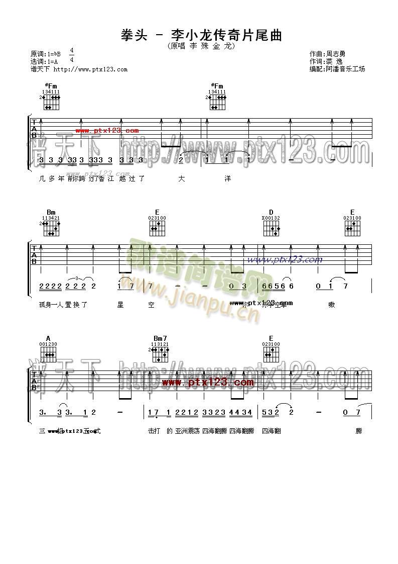公众号:绵羊乐谱 拳头(李小龙传奇主题曲)免费弹唱吉他谱_六线谱:李殊.金龙 点击: 1000 图片可能经过缩放,手机长按或点开后长按保存,电脑鼠标右键保存. (网络) 公众号:绵羊乐谱 | 官方QQ群:978773290 不吃独食,学会分享!本文链接:http://www.shaomingyang.com/btb/31659.html 转载请标明出处,尊重原创(๑╹◡╹)ノ。如信息有误或版权疑问,请通过网站底部联系我们会第一时间处理,感谢理解支持(◕ᴗ◕✿)!