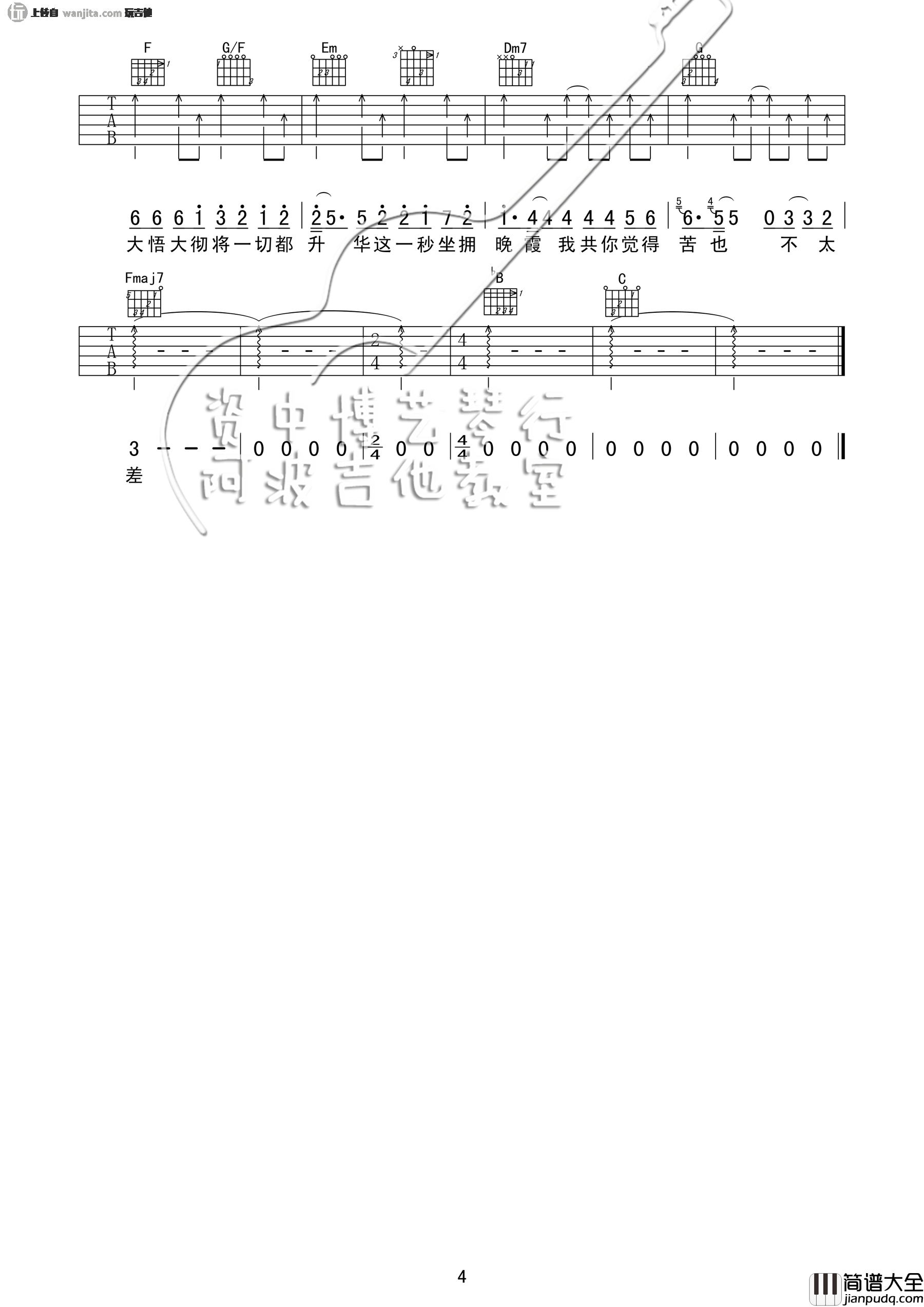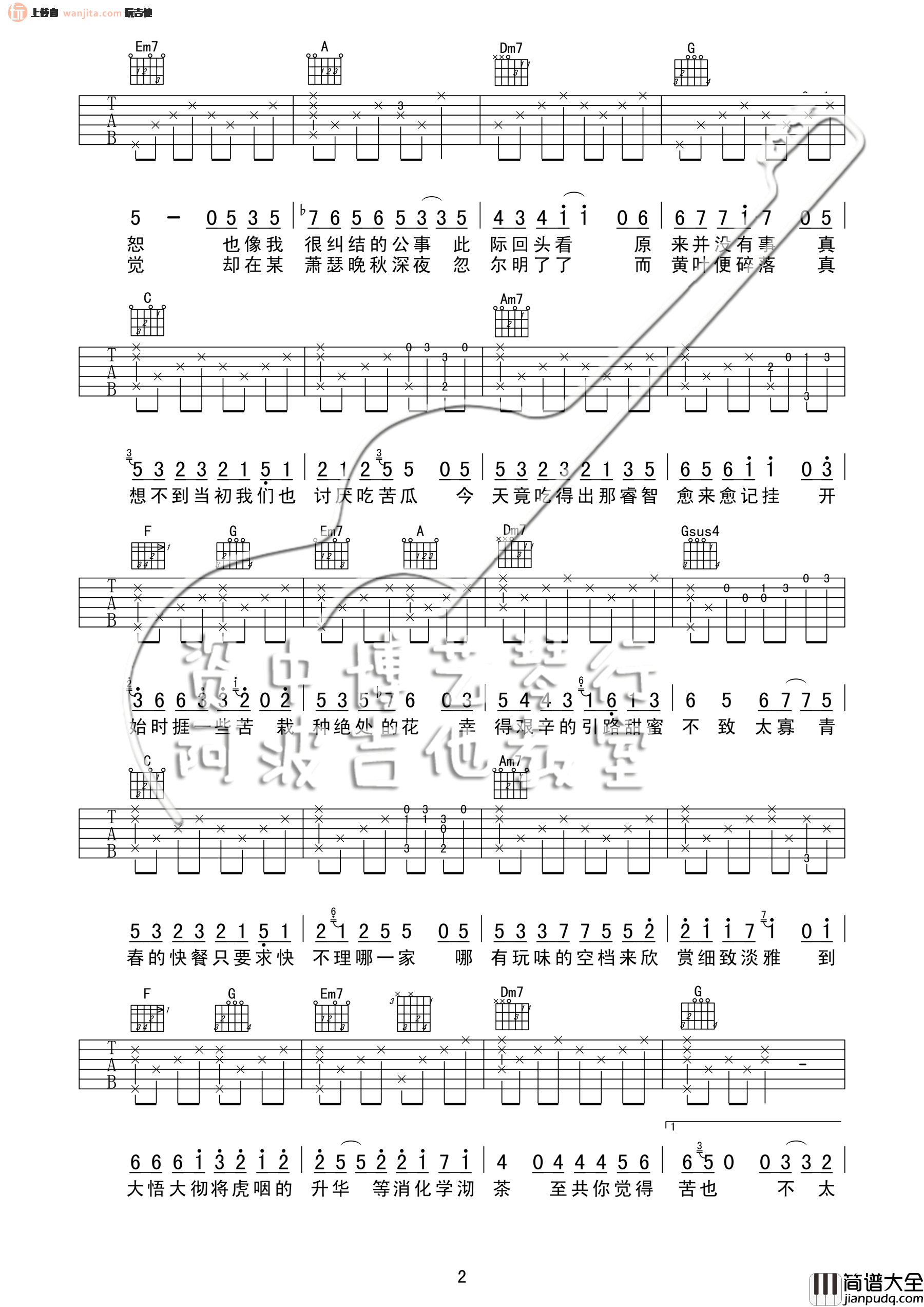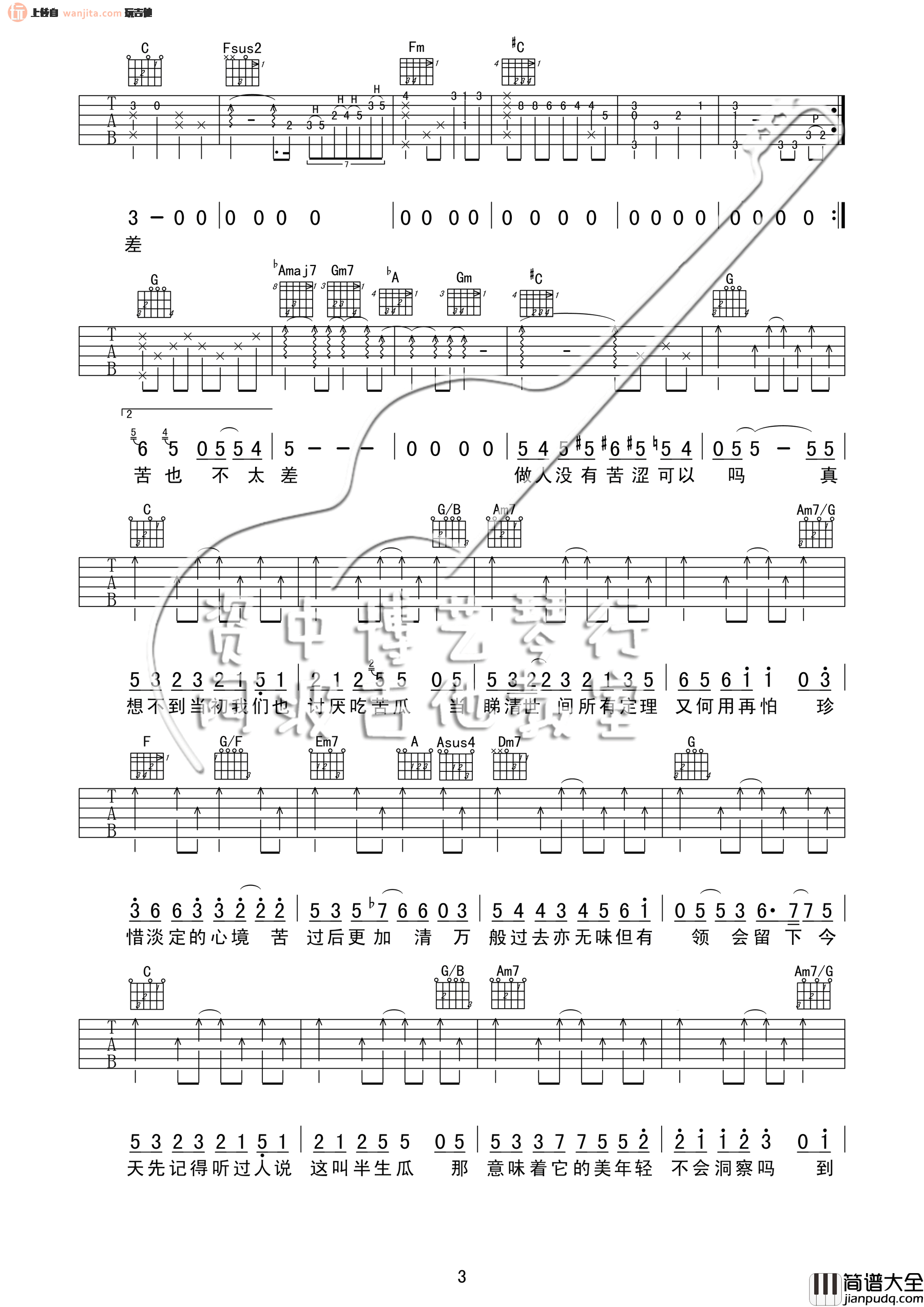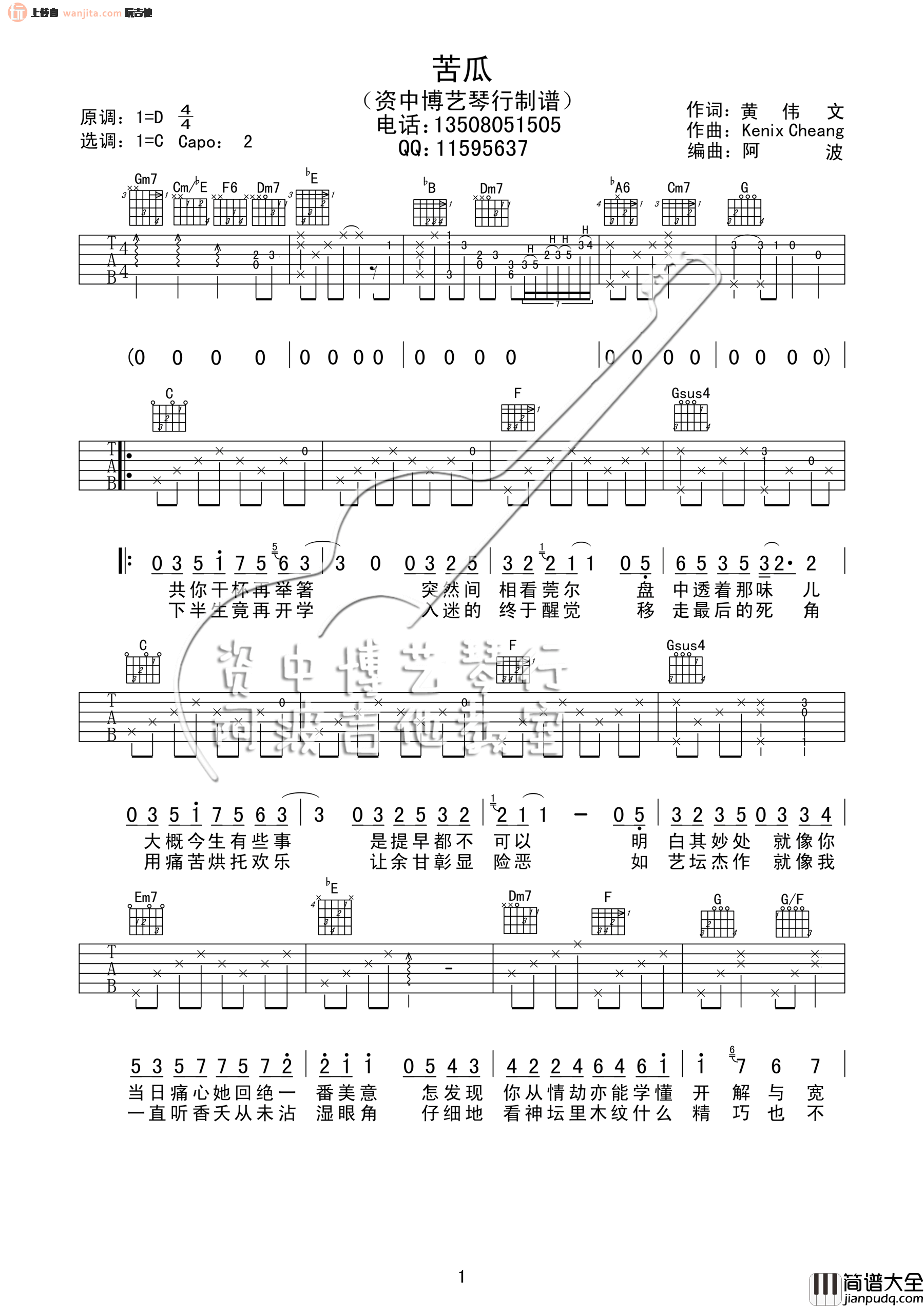 陈奕迅《苦瓜》吉他谱【高清弹唱谱】,总共4张高清图片谱,原调为D调,选用C调指法,节拍4/4拍,建议使用变调夹夹2品,弹唱难度初级。