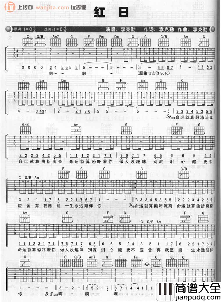 红日吉他谱是李克勤的一首成名曲之一,这首歌选用C调编配,节奏频率较快,但是扫弦节奏并不复杂,有序的扫出层次感,应该同样可以用吉他完美的演绎。这个歌曲里面用坚持的声音鼓舞人心能够跨过每一个人生低谷每一个人生的难处,加上快速激昂的旋律,唱出了一种积极的人生心态。