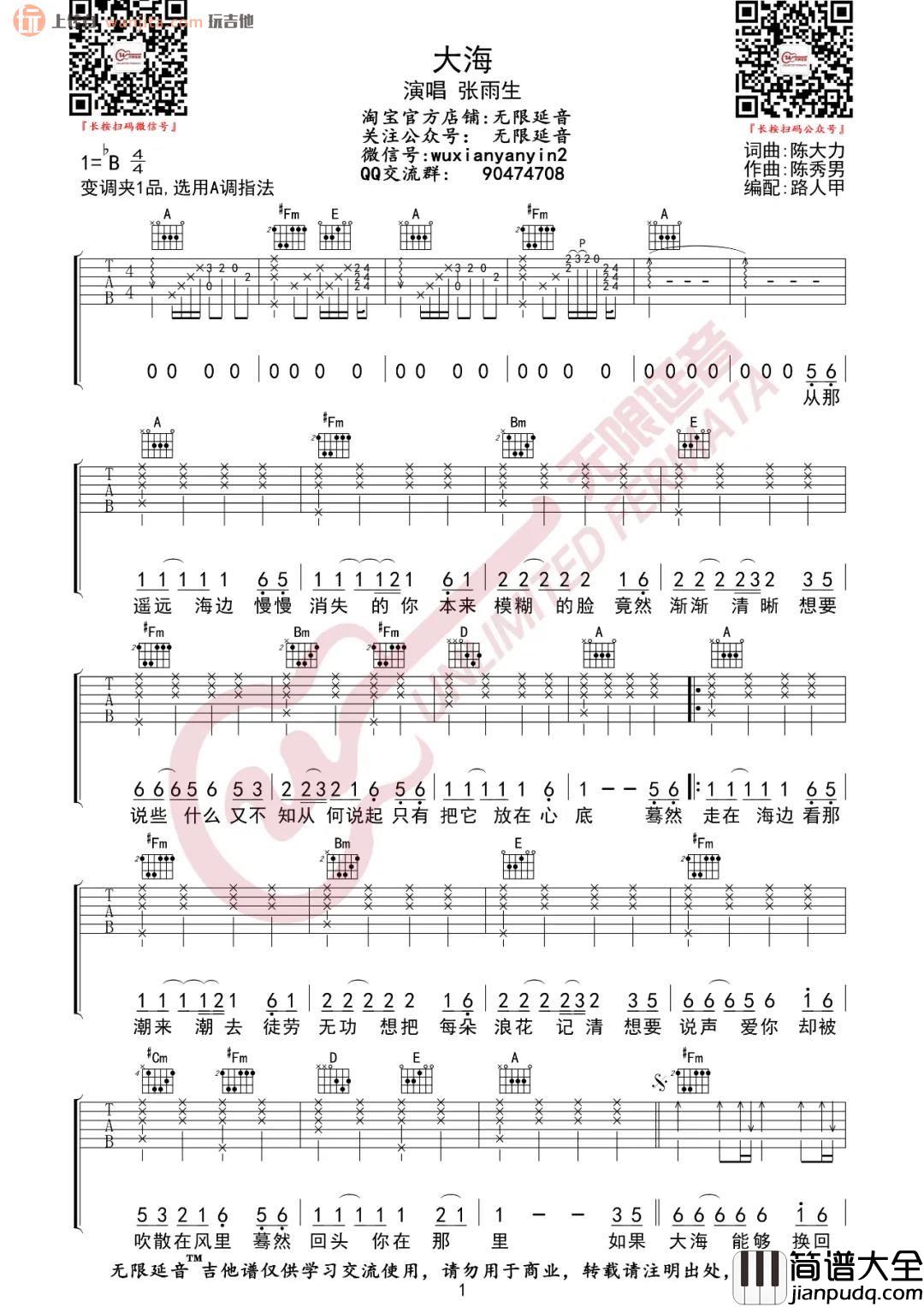《大海》吉他谱,由无限延音编配,原调是bB调,选用A调指法,变调夹夹1品,完整的前奏部分,主歌基本是按照原版的钢琴编曲而制谱,也是非常简单的和弦弹唱,副歌用扫弦弹唱即可。