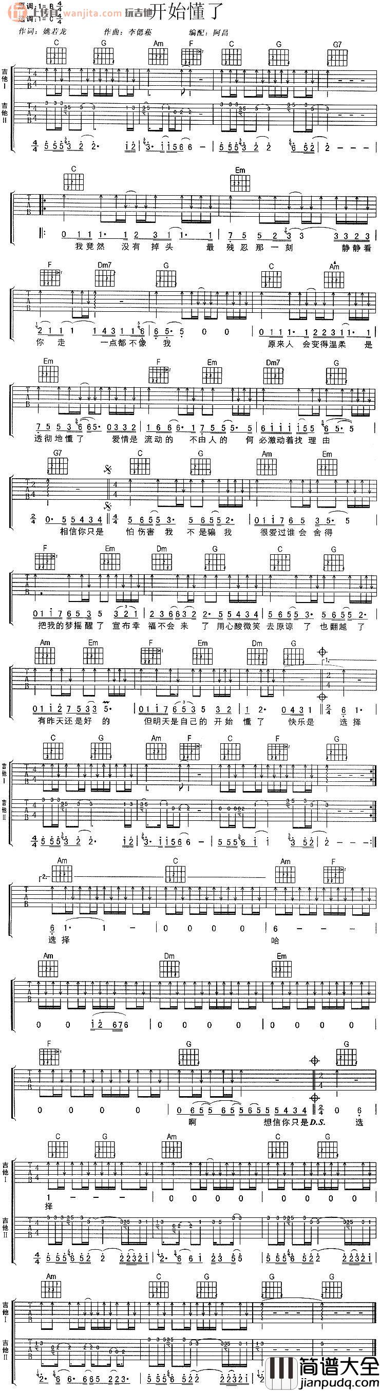 《开始懂了》吉他谱,原调B调,选用C调,不使用变调夹。整体比较简单,适合新手练习,需要注意的是歌曲里面的情绪涌动,孙燕姿的歌曲总是不容易唱出那种情感。