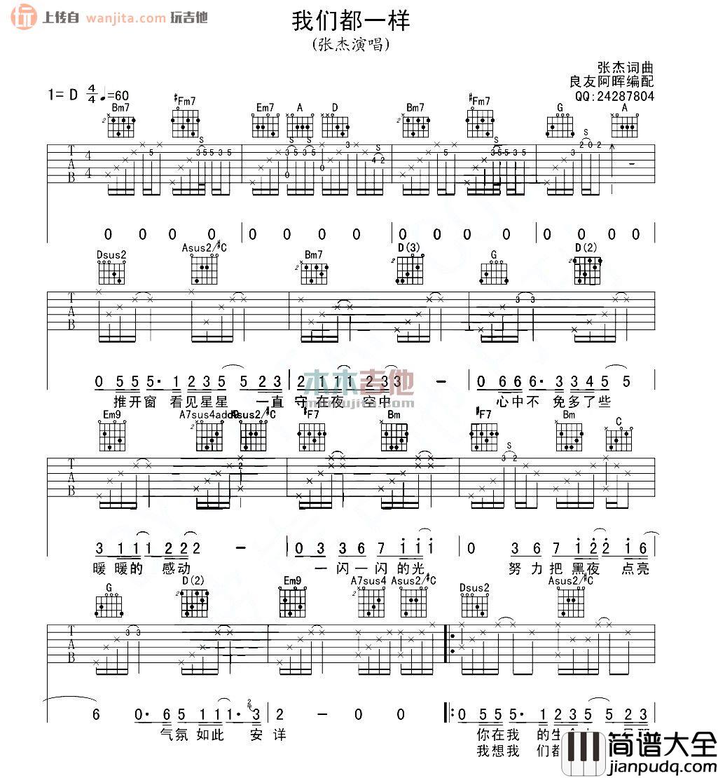 《我们都一样》吉他谱,G调,不使用变调夹,良友阿晖编配。歌曲整体难度中等,这首歌主要表达的是情感,所以吉他能很好地搭配这首歌,很适合吉他弹唱的一首流行音乐。