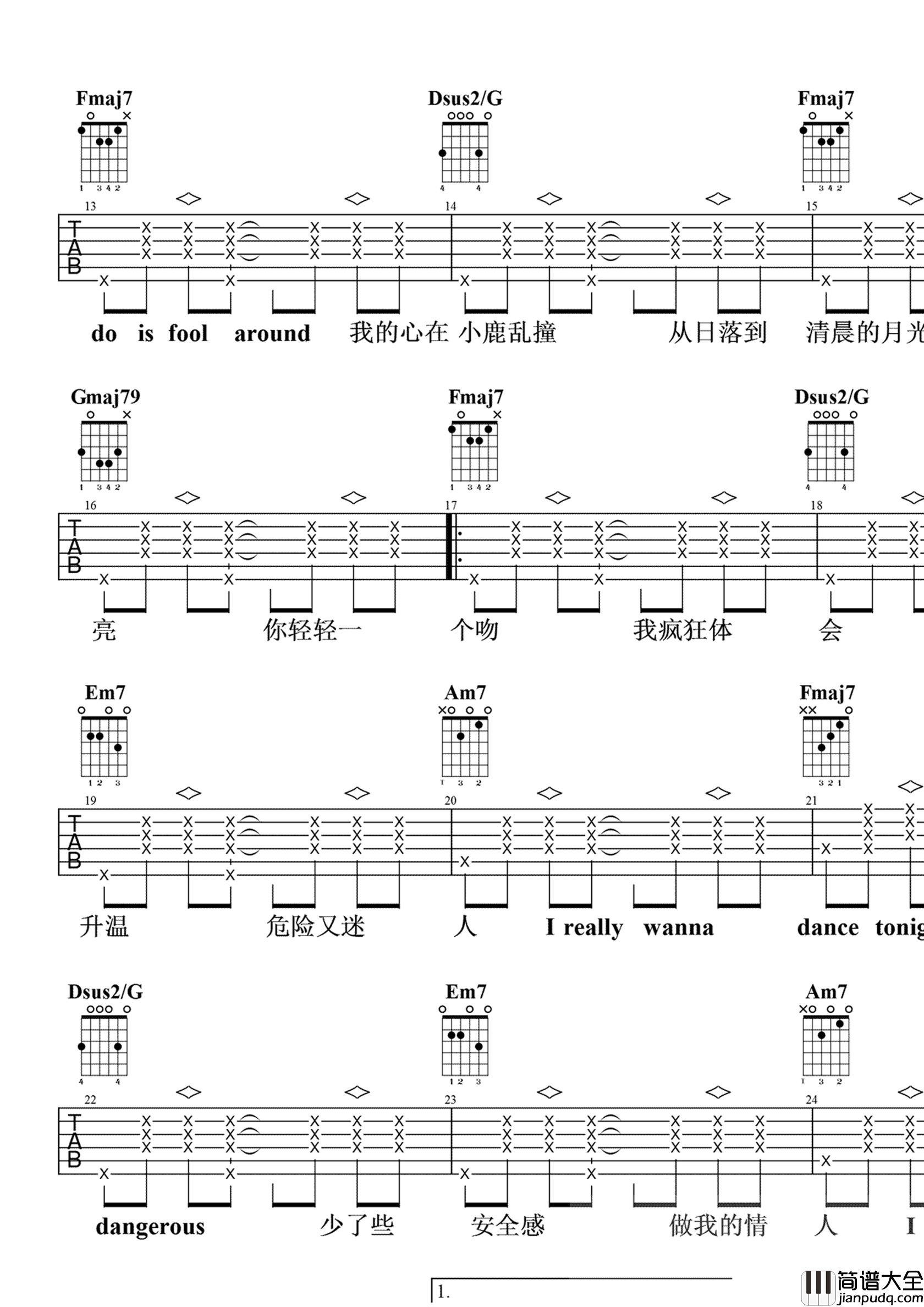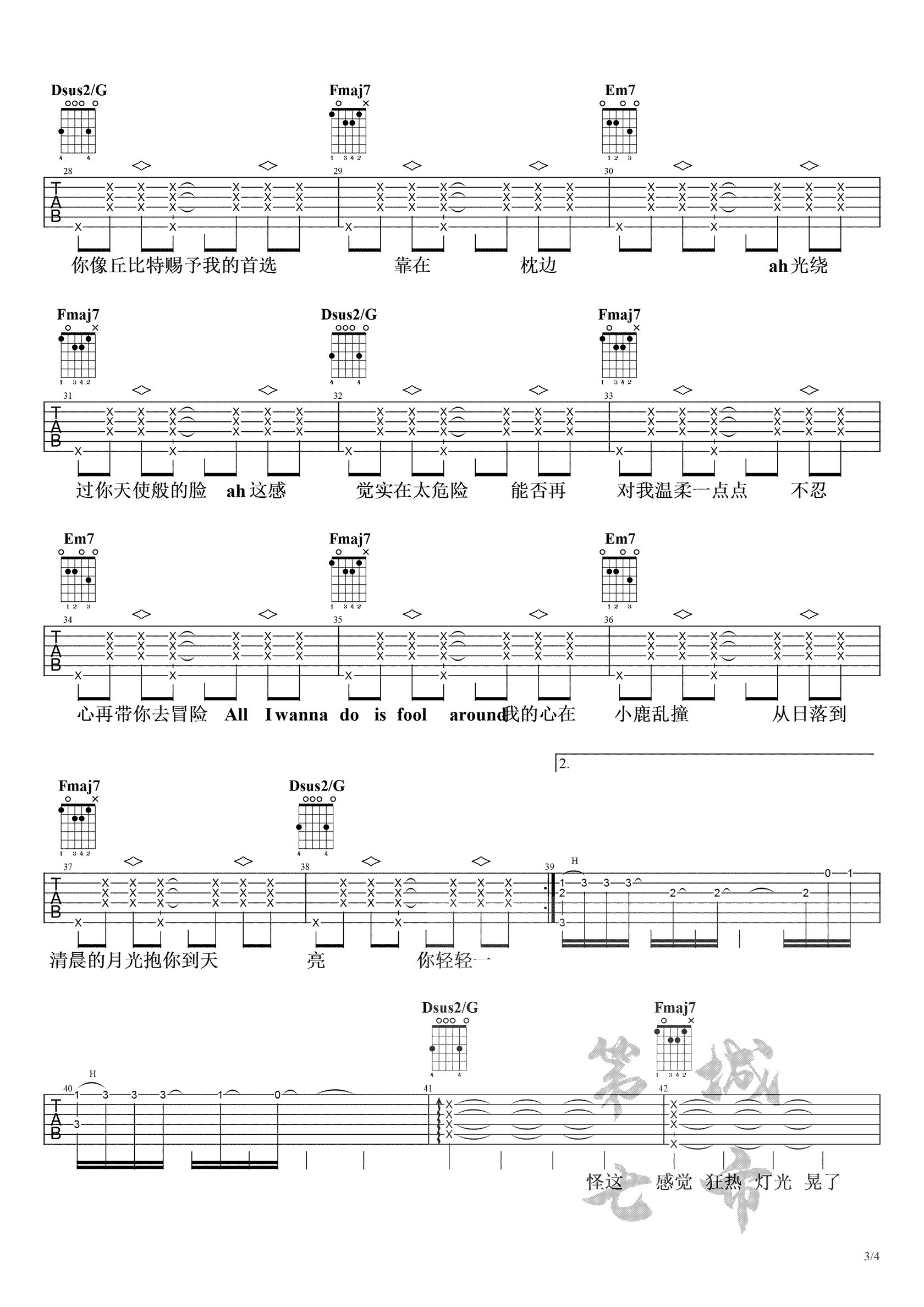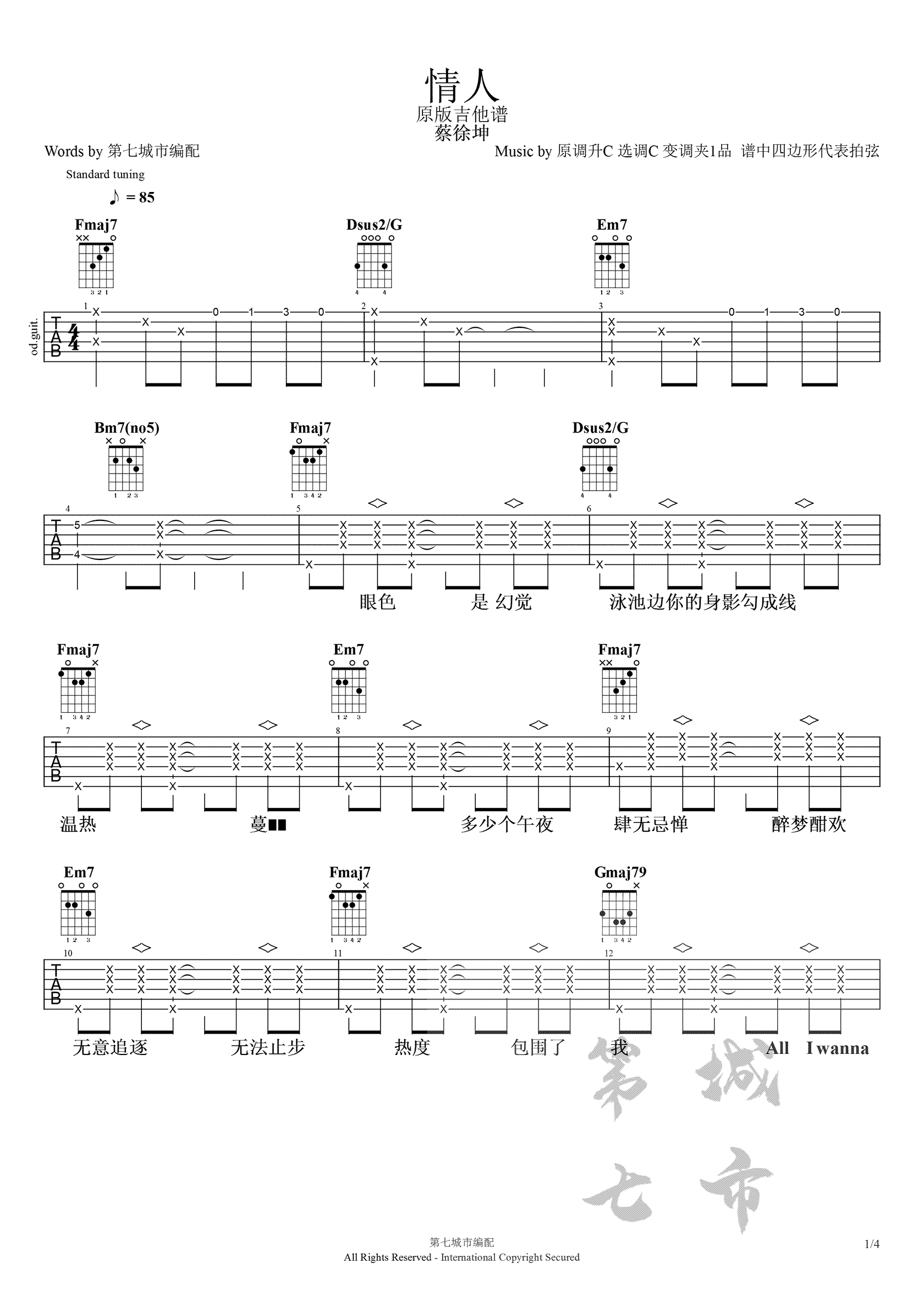 蔡徐坤《情人》吉他谱总共4张高清图片谱,原调#C,这个版本选用的C大调和弦弹唱,大家可以把变调夹夹在一品处弹唱,即可还原原调。这首歌是蔡徐坤自己作词作曲演唱的歌曲,迷幻的节奏点缀成了这首歌的标识符,迷人的声音,整首歌的节奏也是恰到好处。目前在他微博发布过后,网络上也开始了流行的小热潮。