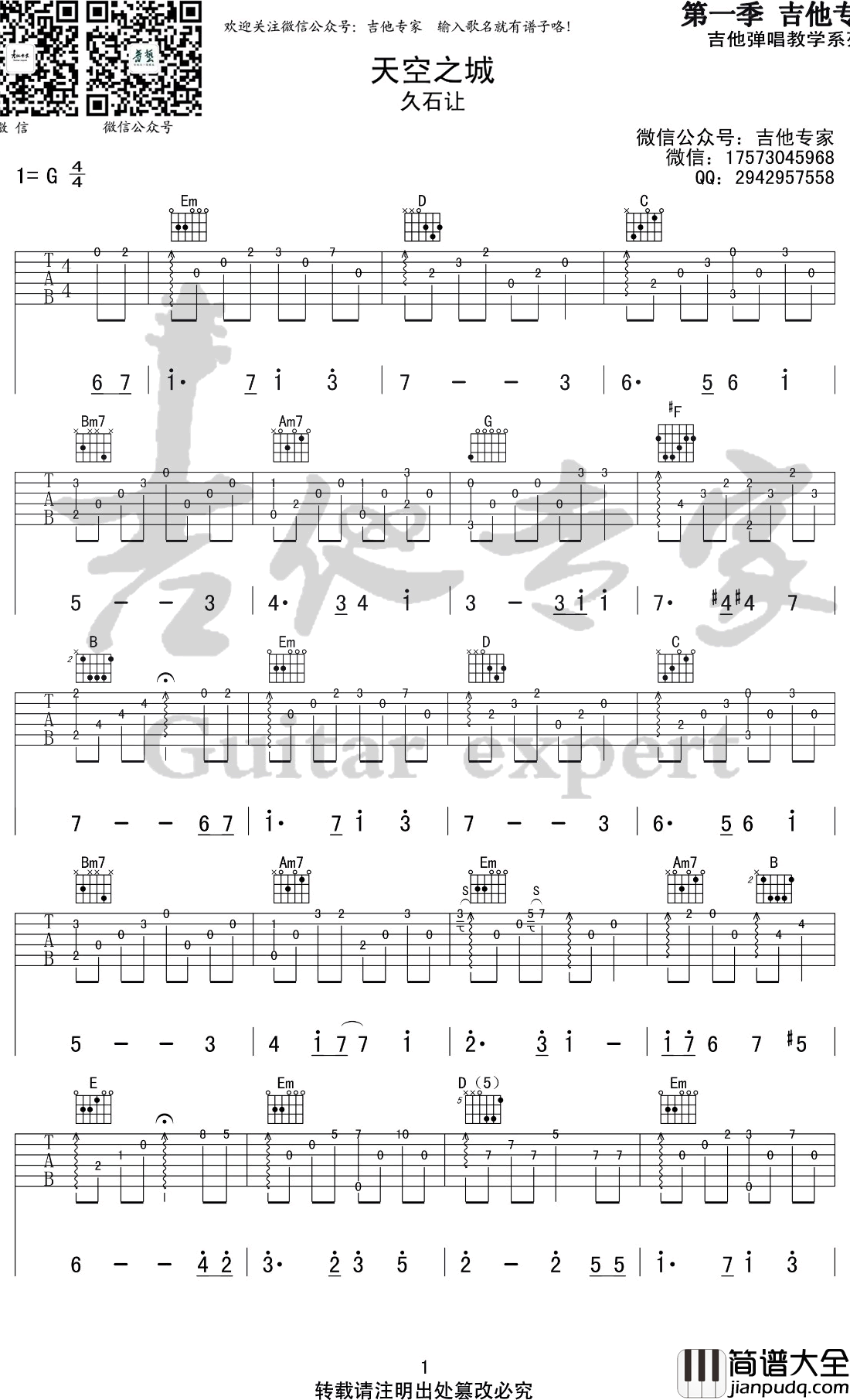 公众号:绵羊乐谱 天空之城吉他指弹谱,久石让的经典曲目,宫崎骏动画电影《天空之城》主题曲,完美版谱版本,吉他专家出品,曲谱网整理上传,因以其让人落泪的优美曲调和动人心弦的美妙音律而闻名全球,被改编成多种版本,成为流传的影视名曲。 公众号:绵羊乐谱 | 官方QQ群:978773290 不吃独食,学会分享!本文链接:http://www.shaomingyang.com/btb/31853.html 转载请标明出处,尊重原创(๑╹◡╹)ノ。如信息有误或版权疑问,请通过网站底部联系我们会第一时间处理,感谢理解支持(◕ᴗ◕✿)!