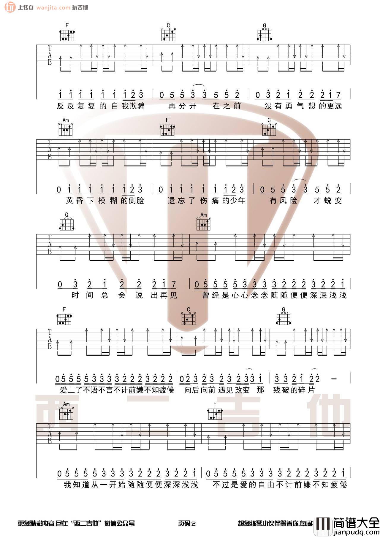 《侧脸》吉他谱由西二吉他(山山吉他)分享,原调是F调,版本选用C调和弦编配,变调夹夹5品处,歌曲并不复杂分解和弦贯穿到副歌部分的时候,就是扫弦弹唱了,可以从下方视频中先看看吉他的弹唱效果,小编认为还是很接近原版,没毛病,喜欢的朋友赶紧练习这首爆火的《侧脸吧》。