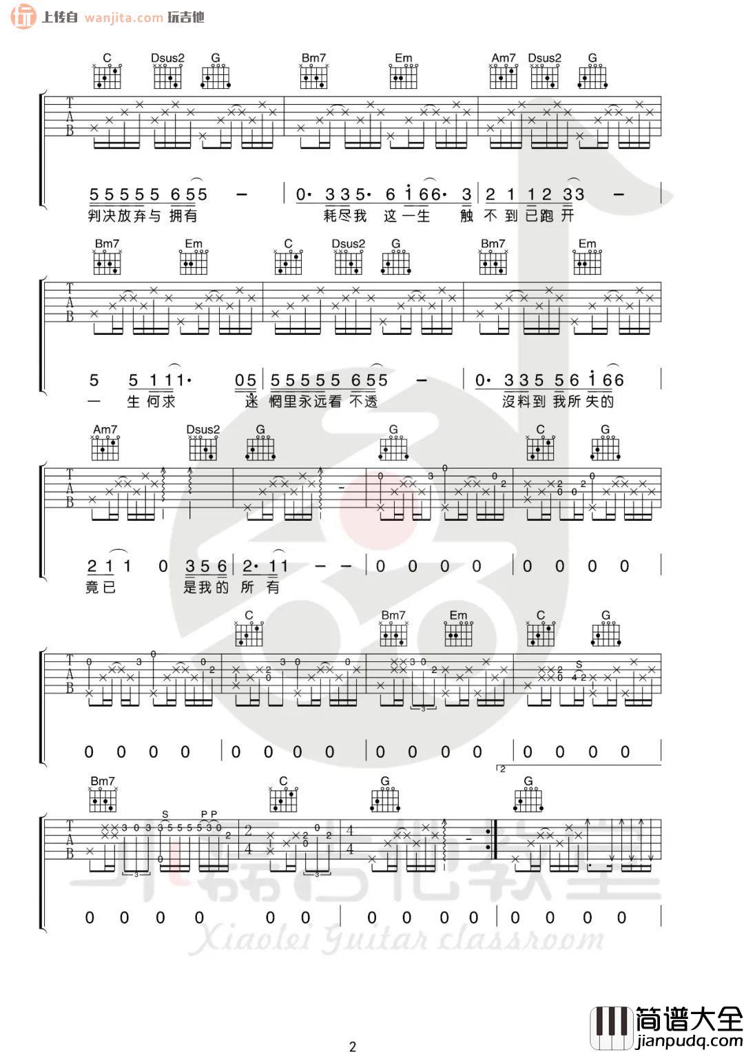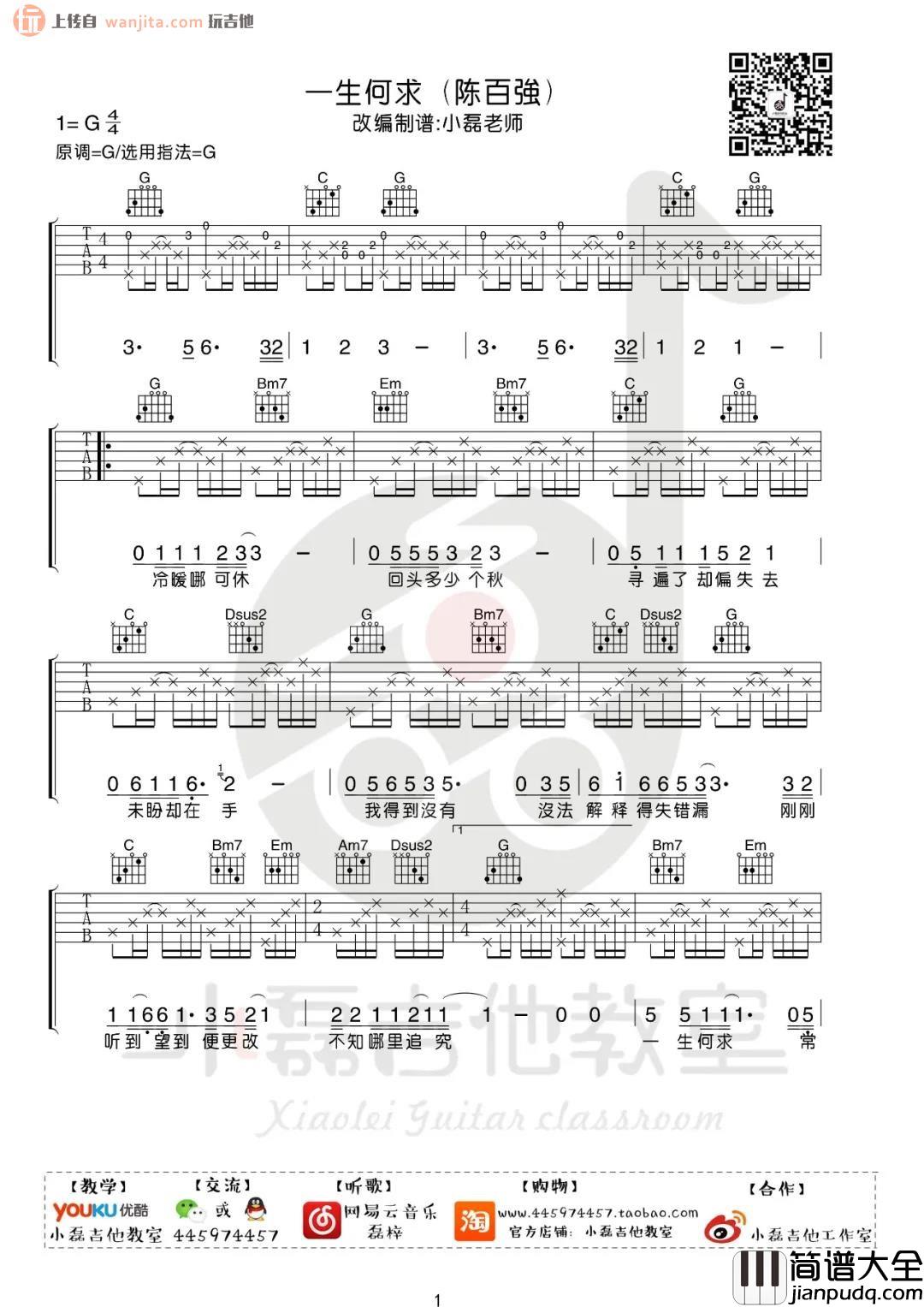 《一生何求》吉他谱,选用G调,由小磊吉他制谱编配,这个版本非常的原版,包含了完整的前奏和间奏,建议喜欢的朋友可以花时间琢磨练习一下,难度适中。