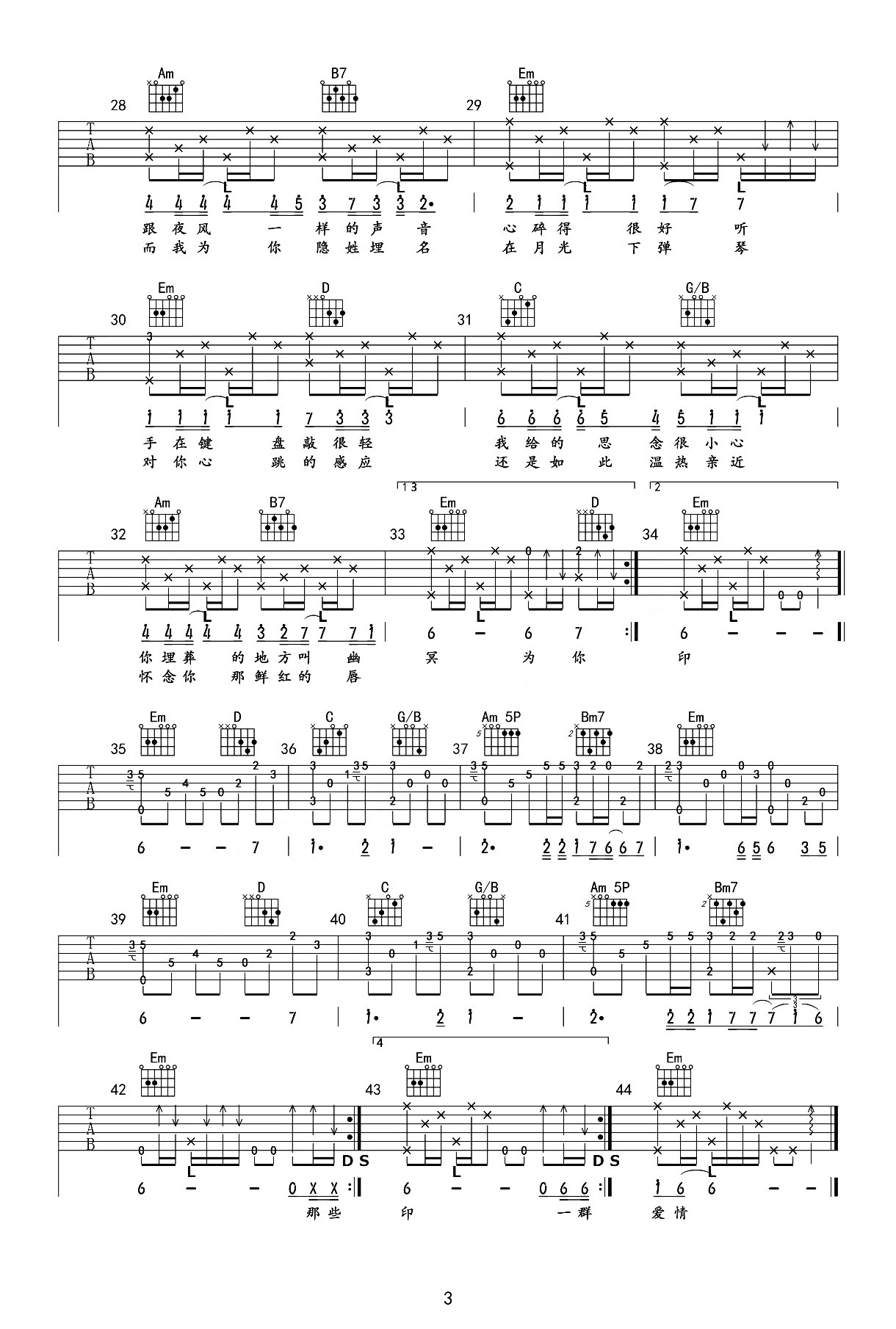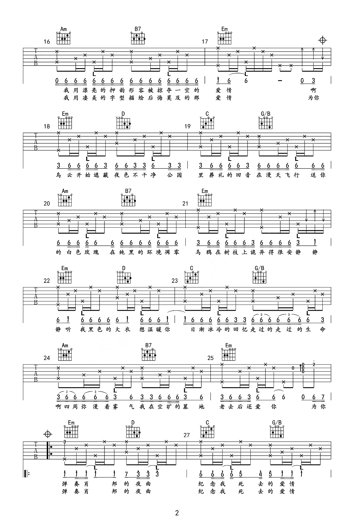 公众号:绵羊乐谱 《夜曲》吉他弹唱谱由深蓝雨吉他编配,原调是A调,选用G调指法,变调夹男生夹1品,女生夹3-5品。总共有3张高清图片谱,难度还是非常大的,适合中级以上水平的朋友练习,大家可以参考老师的教学视频,会便于掌握这首曲谱。 《夜曲》吉他弹唱教学视频 公众号:绵羊乐谱 | 官方QQ群:978773290 不吃独食,学会分享!本文链接:http://www.shaomingyang.com/btb/31911.html 转载请标明出处,尊重原创(๑╹◡╹)ノ。如信息有误或版权疑问,请通过网站底部联系我们会第一时间处理,感谢理解支持(◕ᴗ◕✿)!