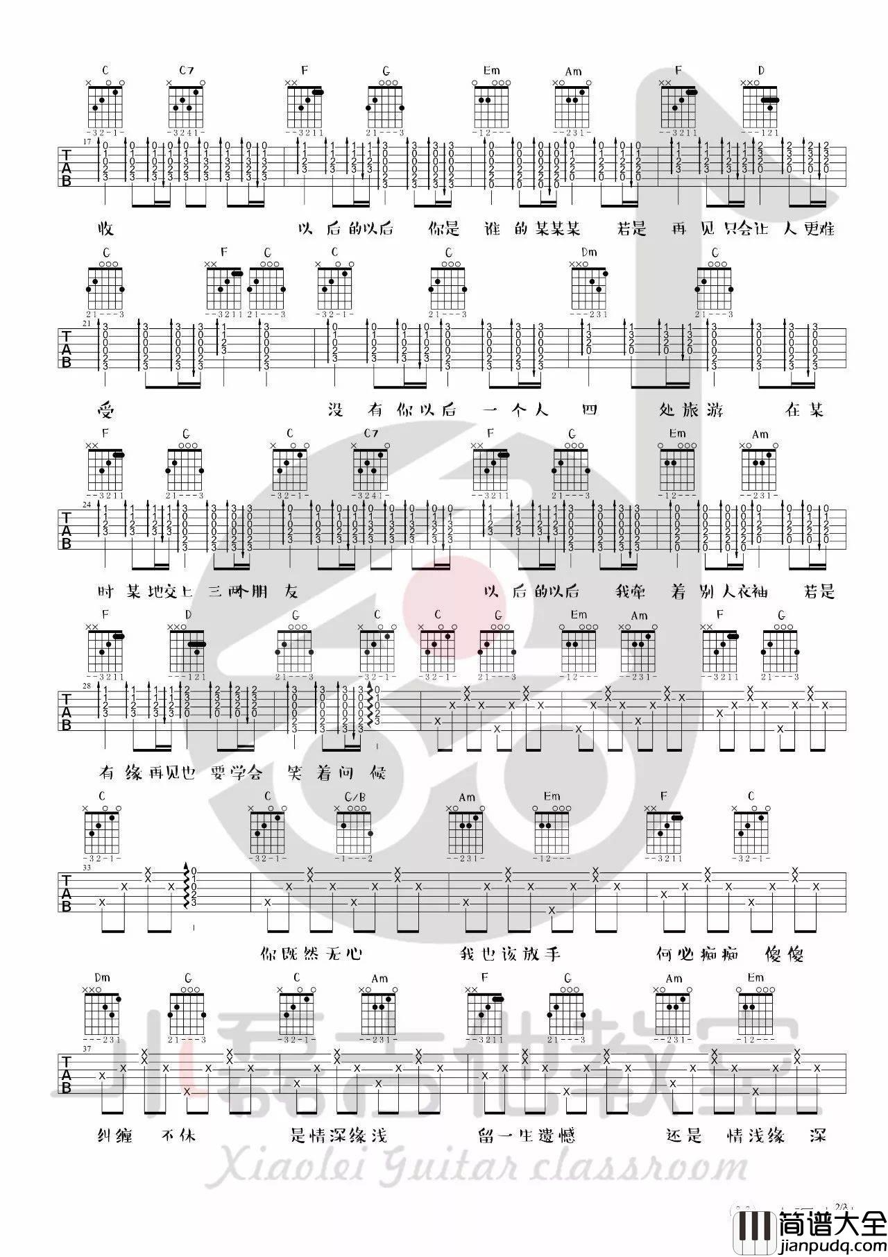 庄心妍的《以后的以后》吉他谱是选用C调编配,这个版本是男生简单版,女生可以适当将变调夹夹在3-5品,根据自己的音域情况决定。这个版本是由小磊吉他提供编配,常规的简单C调和弦配合基本的分解节奏,新手可以很快速的上手。