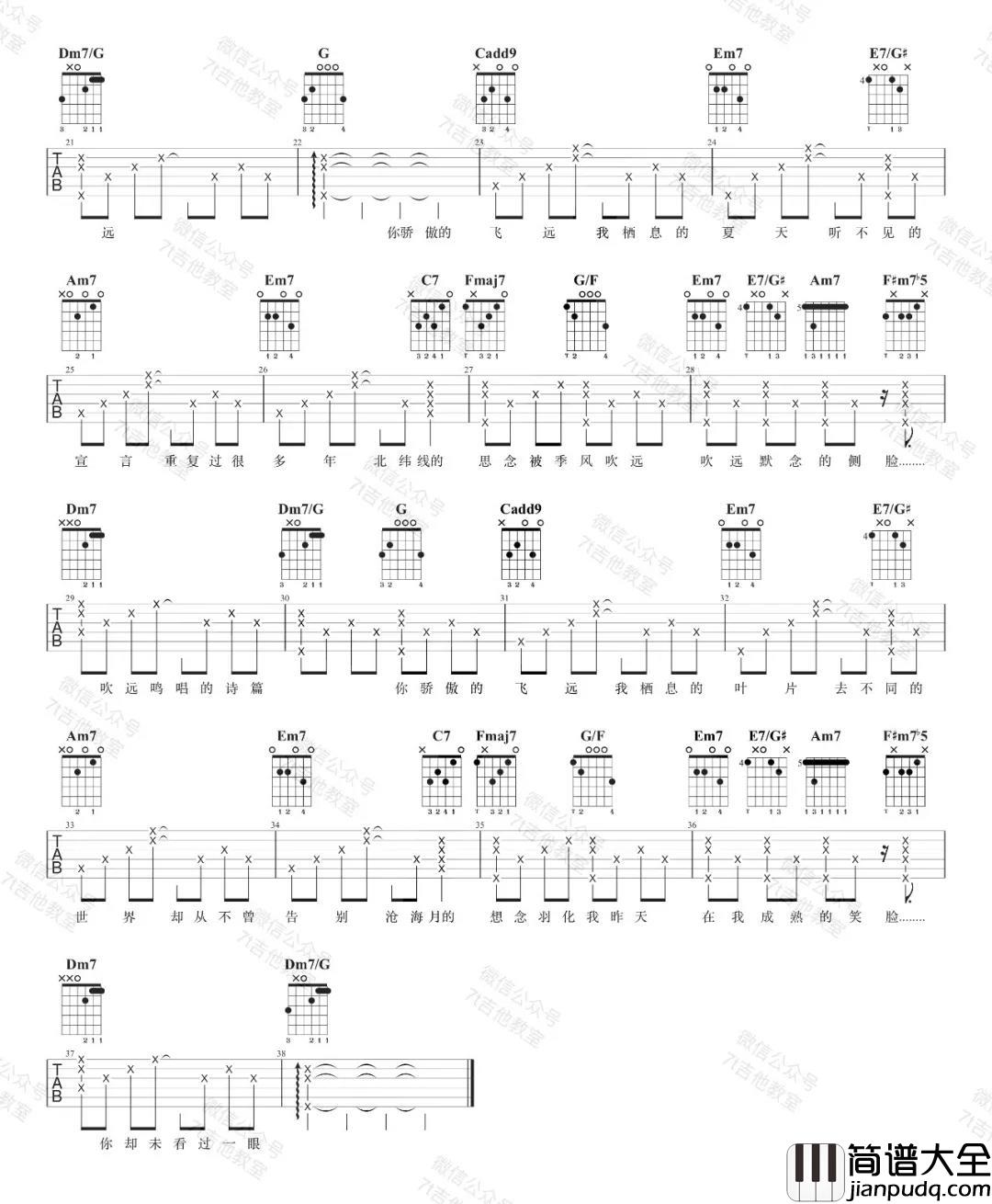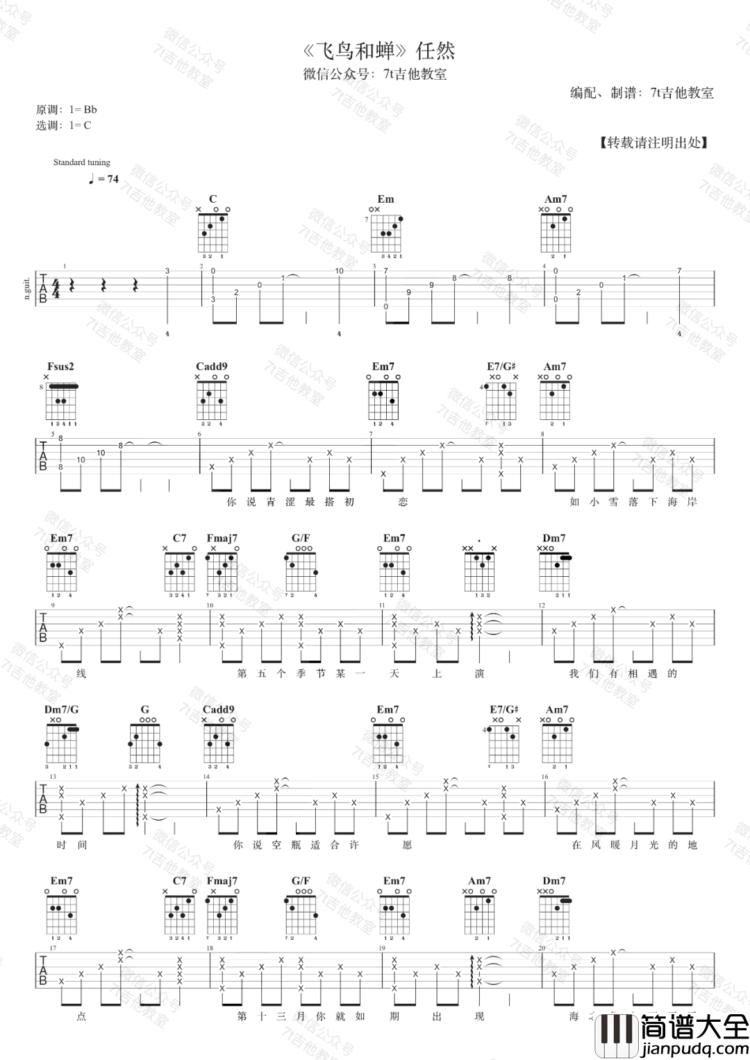 《飞鸟和蝉》吉他谱由7T吉他教室提供分享,原调是bB,选用C调执法编配,这个版本是目前比较复杂的编配,和弦和指法更加丰富。这个谱子是通过男声来演示弹唱,男声可以将变调夹夹在1品,感兴趣的朋友可以参考下方的演示视频。
