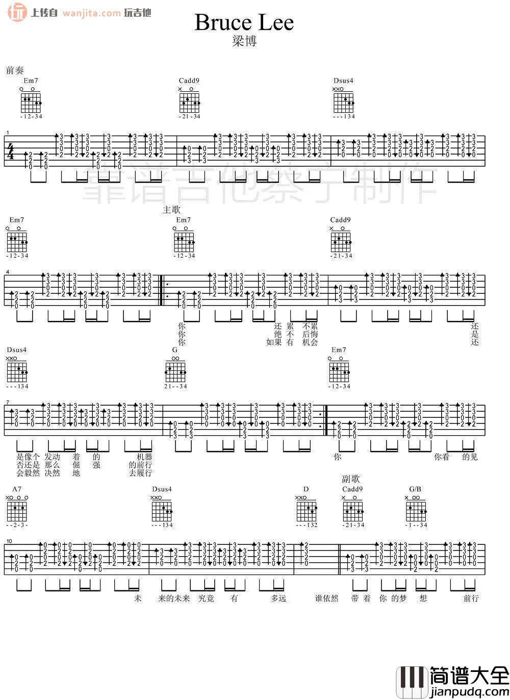 《Bruce Lee》吉他谱,C调,不使用变调夹。这首歌曲的弹唱难度属于中等,新手不建议学习,适合进阶的老哥们你练习和学习,这首歌曲唱起来也是有一定难度的,大家要注意弹唱时的节奏。