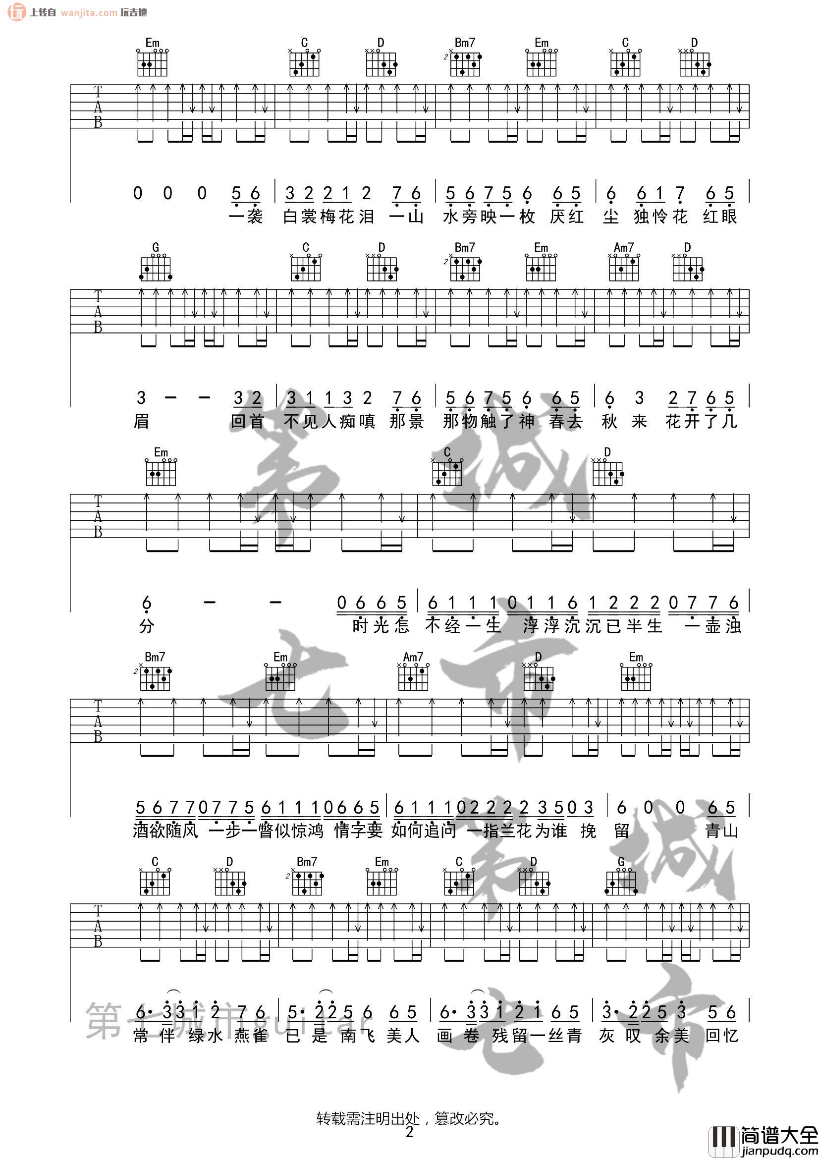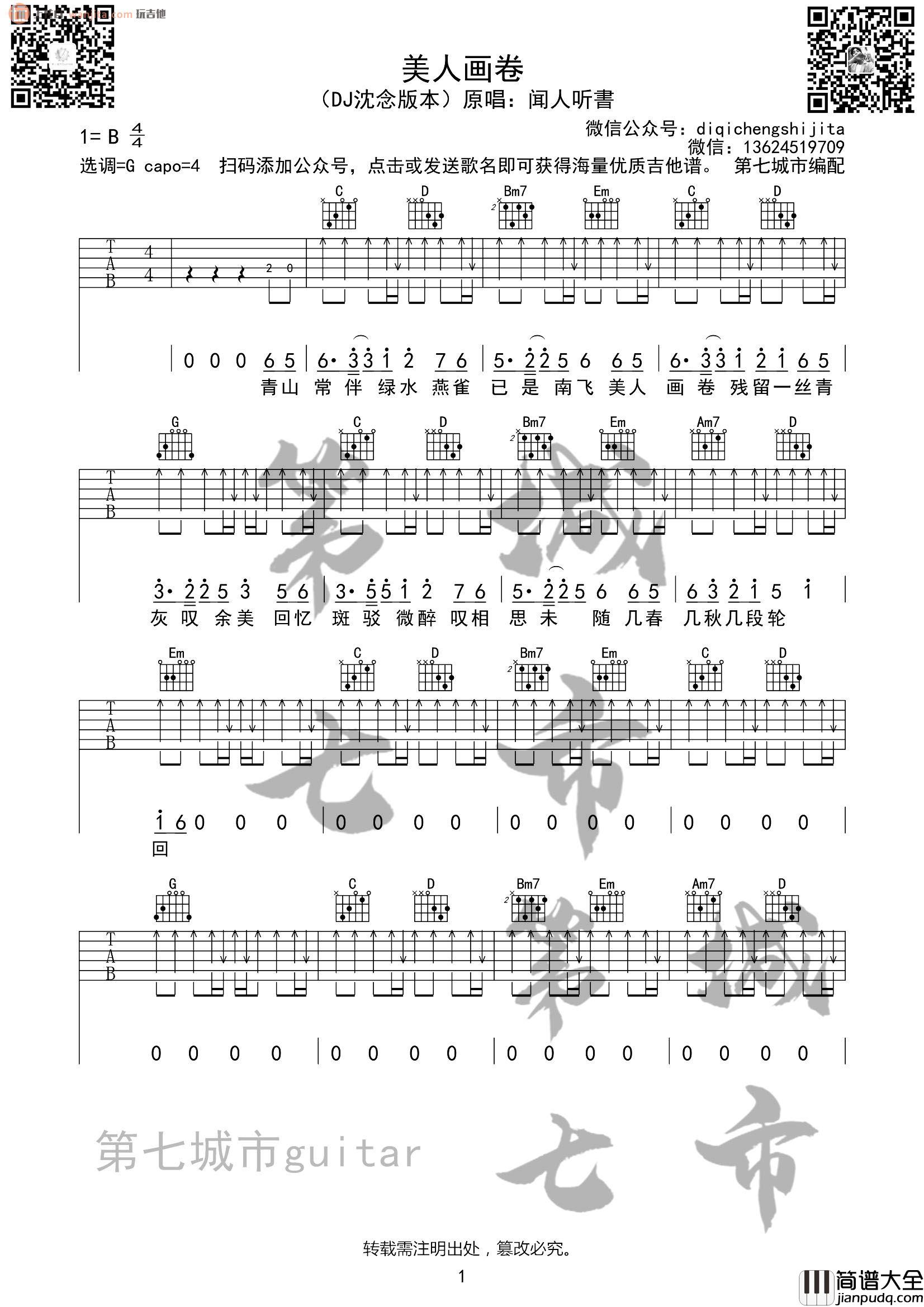 《美人画卷》吉他谱,原调B调,选用G调,不使用变调夹。这首中国风歌曲最大的特点是全篇的扫弦,优美而又有节奏感。比较好听的简单的一张曲谱。适合学习练习。