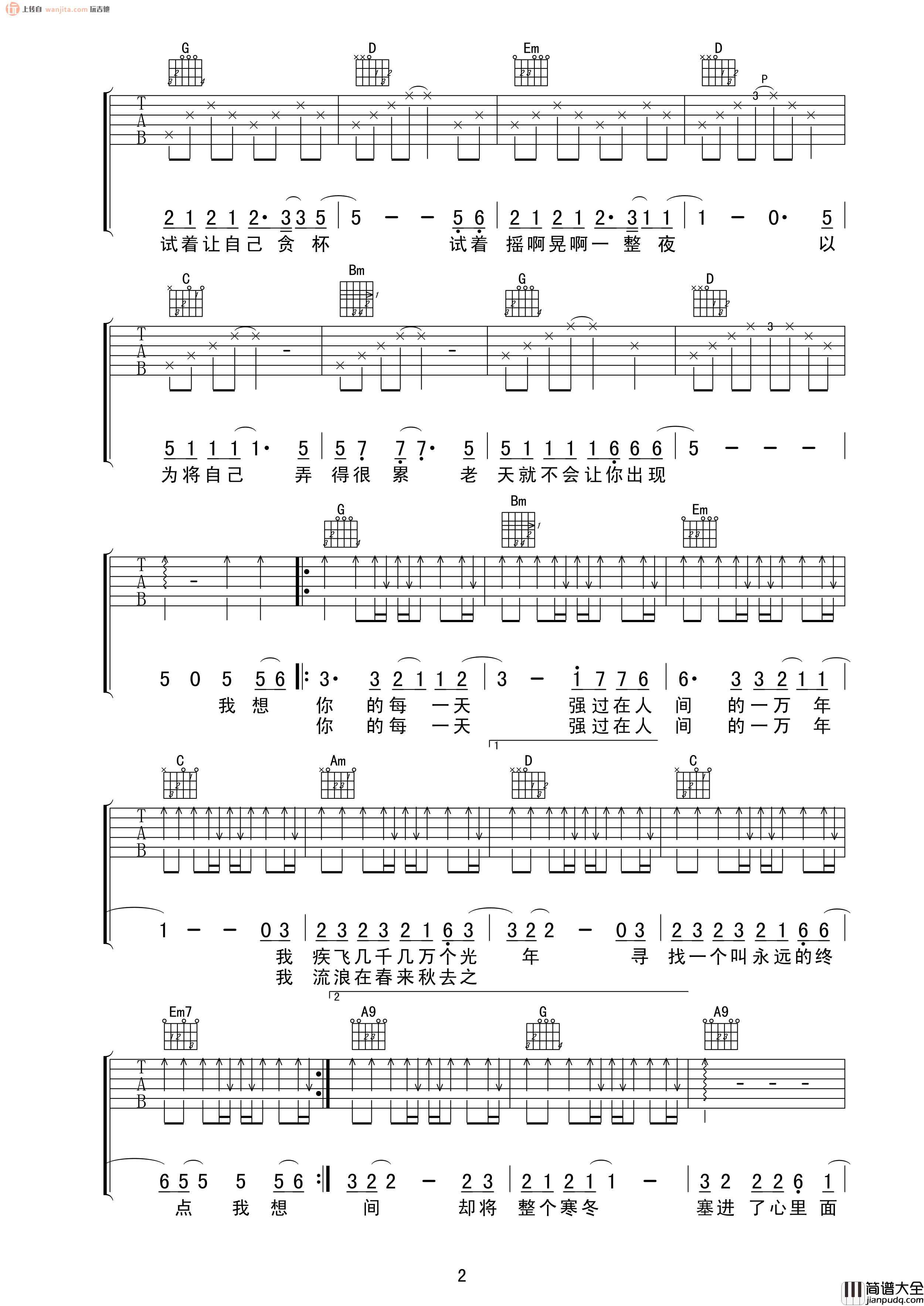 《一天一万年》吉他谱,由网友“梦断弦音”选用G调编配,标准的前奏部分,分解和弦的弹奏主歌部分,副歌用扫弦弹唱,扫弦的地方一定要注意力度有深有浅,不可全部过度,否则这首歌会被弹出噪音的感觉,也就不太适合原版的编曲定位了。